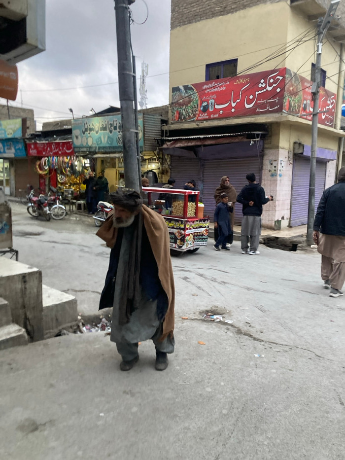 An elderly man in a worn coat walks along a gray street. Shops line the street, with signs in a script, possibly Urdu. Several people stand by a food cart, while a few others stroll by. The sky is ove…read more