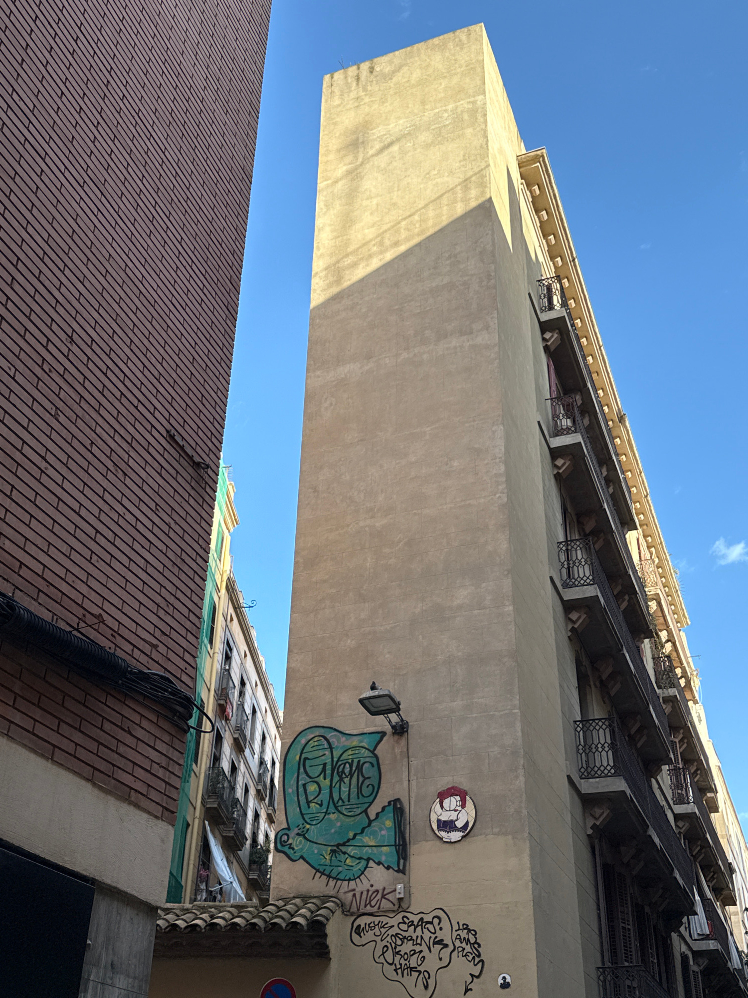 An upward shot presents two buildings under a bright blue sky. The building in the lower frame has a red-brick facade, while the upper building is much taller, with a cream-colored wall and balconies.âĻread more