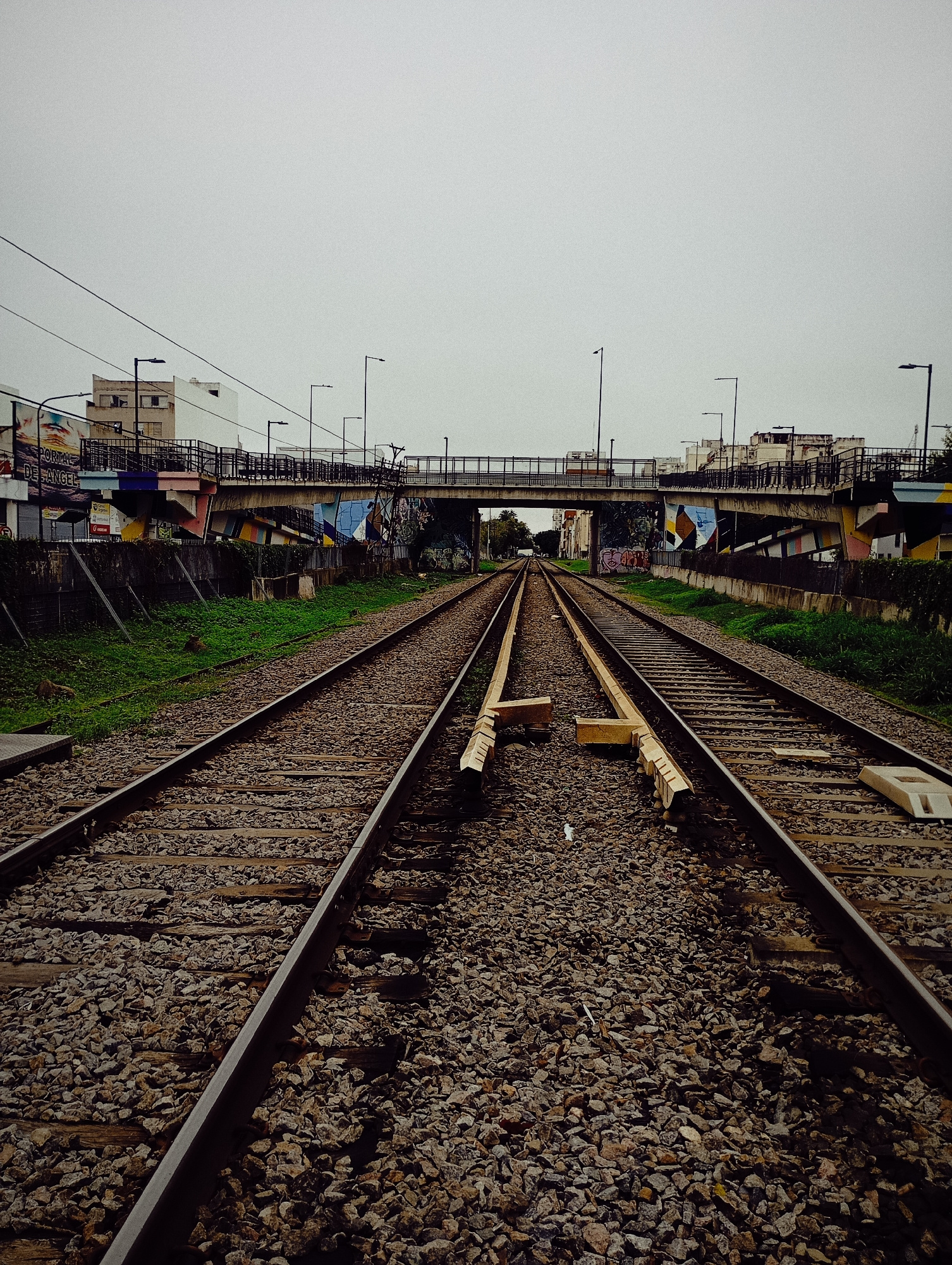 The photograph depicts a straight segment of abandoned railroad tracks receding into the distance, converging towards a bridge in Buenos Aires, Argentina. The tracks are embedded in a bed of gravel. W…read more