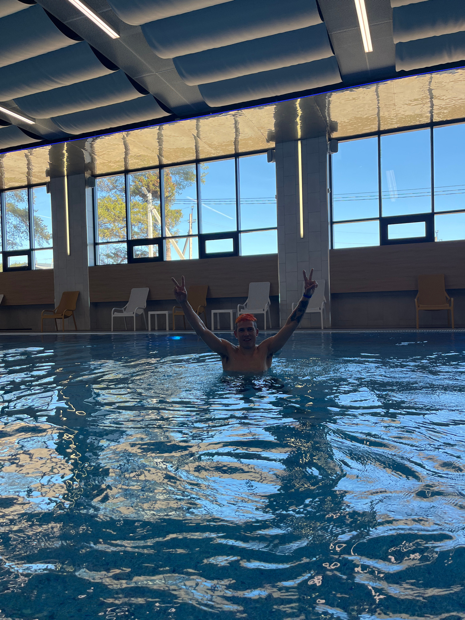 A man with short orange hair, wearing a swim cap, is in a swimming pool and giving the peace sign with both hands. He is facing the camera. The indoor pool has large windows with visible trees and power lines outside. There are empty chairs along the side of the pool. The location is an indoor pool with a modern design. There is no way to verify the location in Votkinsk, Russia from this image. | Open Wire