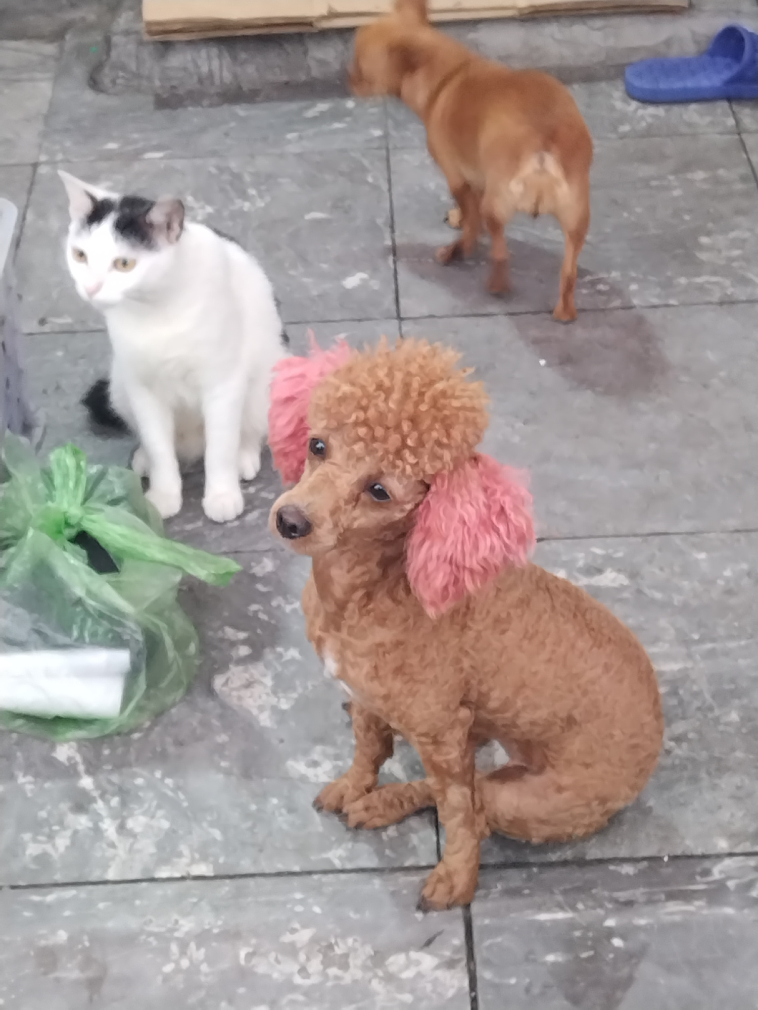 An eye-level shot captures three animals on a grey, tiled or concrete floor, likely in an indoor or covered outdoor setting in Bai Chay Ward, Vietnam. In the foreground, a brown poodle with distinctiv…read more