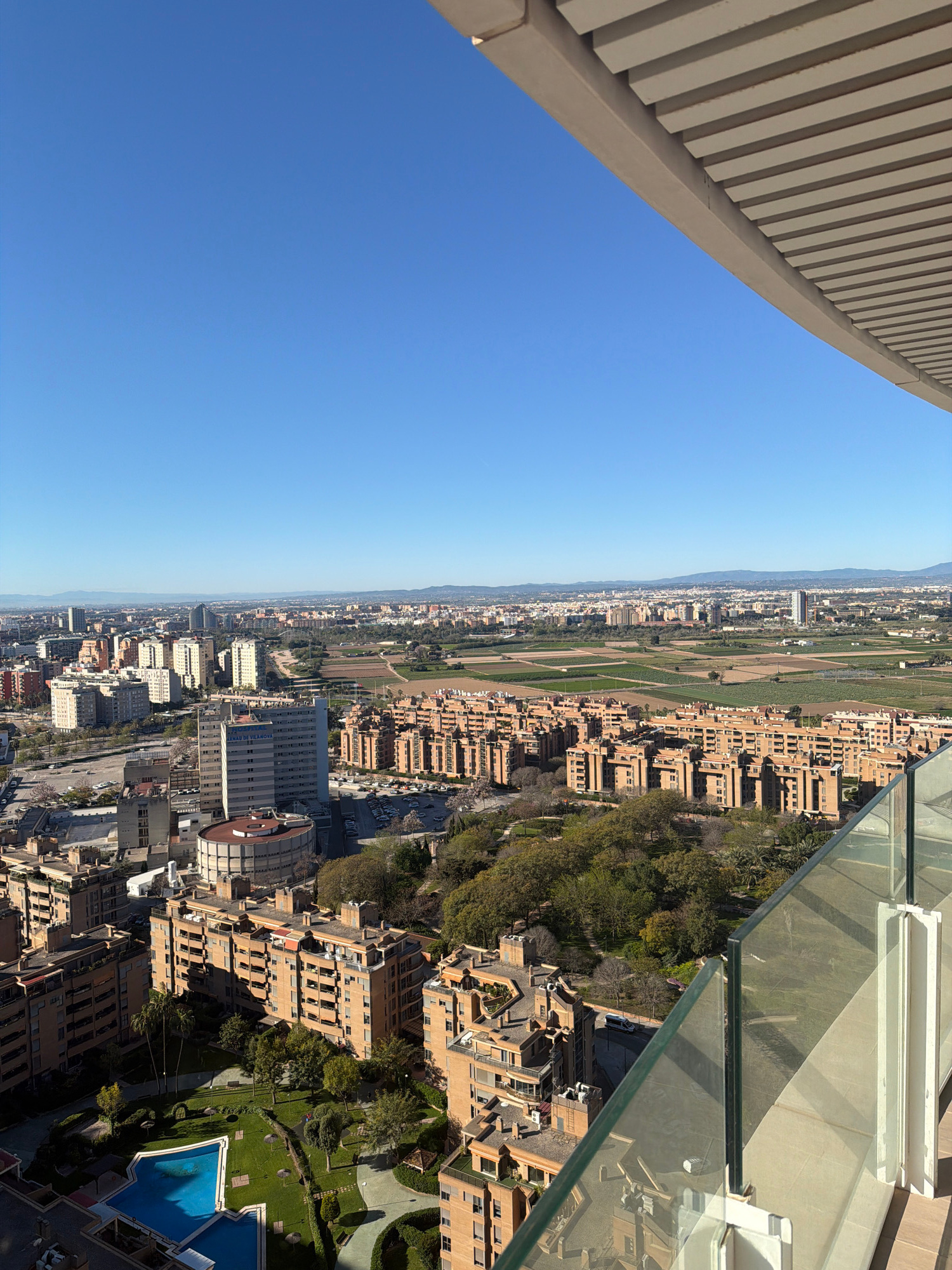 An aerial view from a high-rise building overlooking Valencia, Spain. A clear blue sky fills the left portion of the image. A portion of the high-rise structure is visible in the upper left. The city…read more