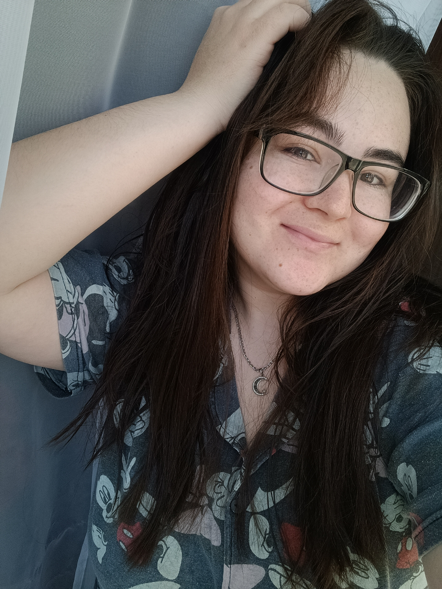 A woman with long, dark brown hair, wearing glasses and a gray shirt patterned with cartoon characters, is smiling at the camera. She has her right hand on her head and a silver necklace with a cresce…read more