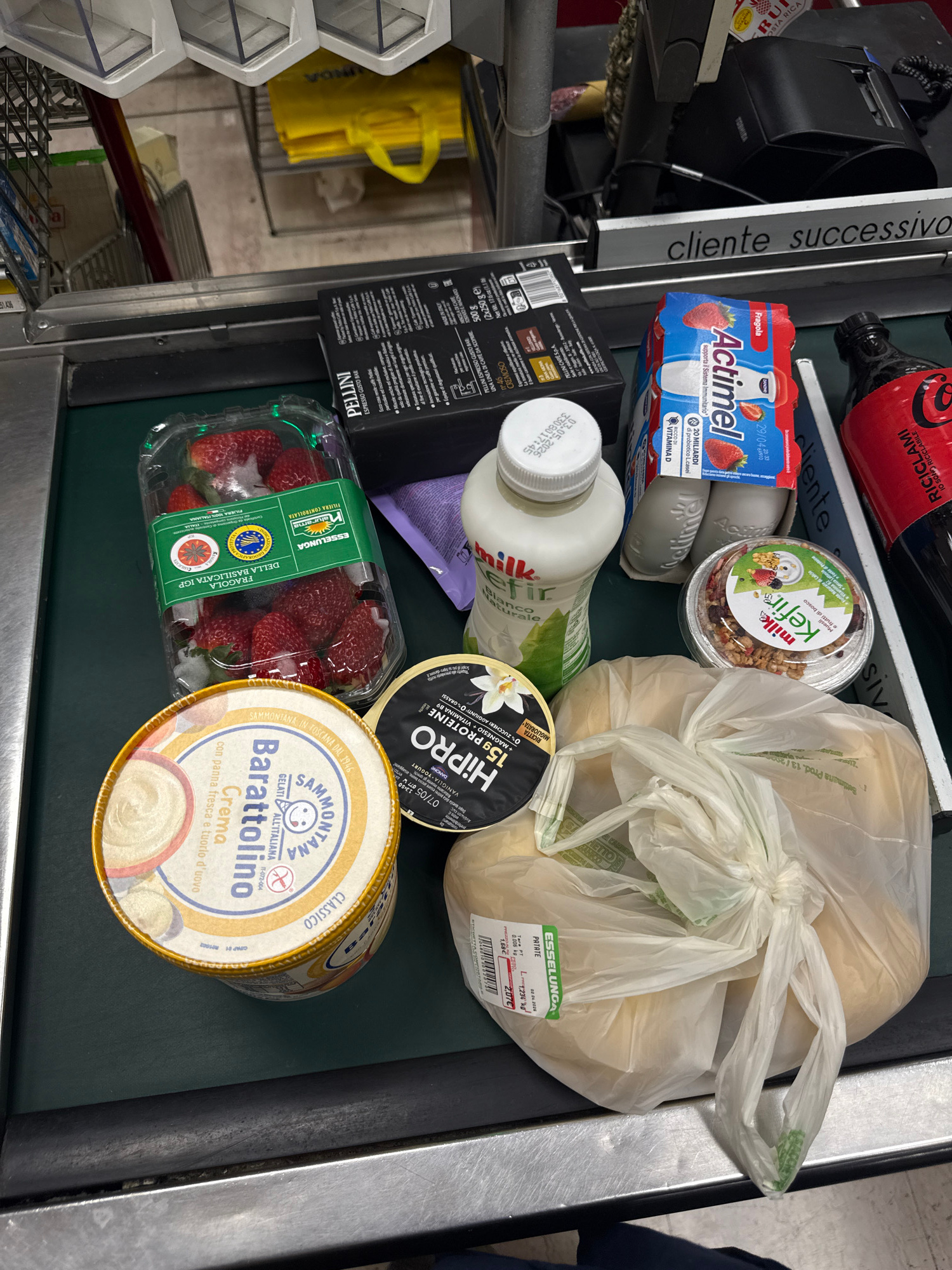 The image shows a collection of grocery items on a checkout conveyor belt, likely at an Esselunga supermarket, as indicated by the branded products and price labels. The products include Actimel yogur…read more