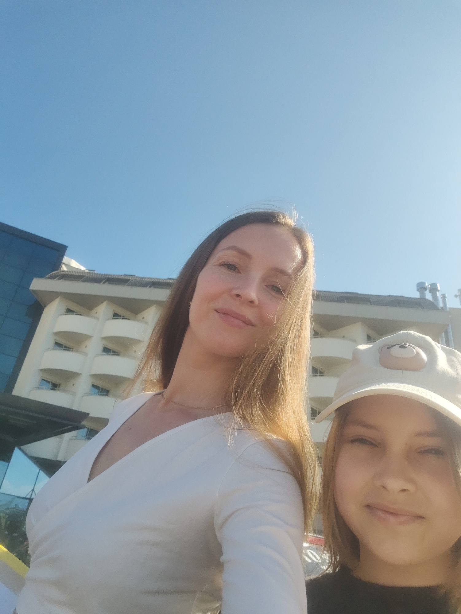 The image depicts a daytime outdoor scene featuring two individuals positioned in the foreground, with urban structures and a clear sky in the background. The photograph appears to be a selfie or take…read more