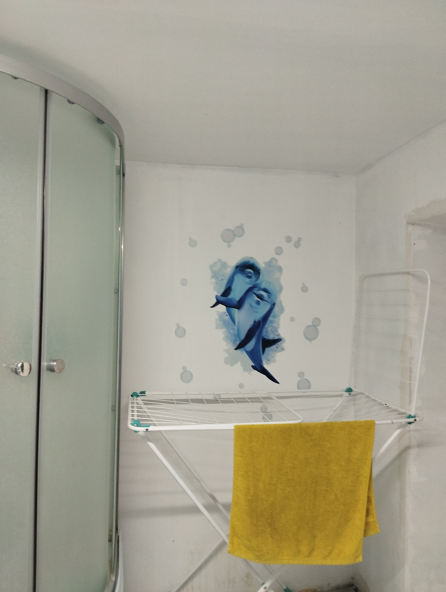 The image shows a bathroom in Krasnogorskoye, Russia. A rounded frosted glass shower stall is to the left. On the wall is a blue dolphin decal with white bubble accents. A white folding drying rack is…read more