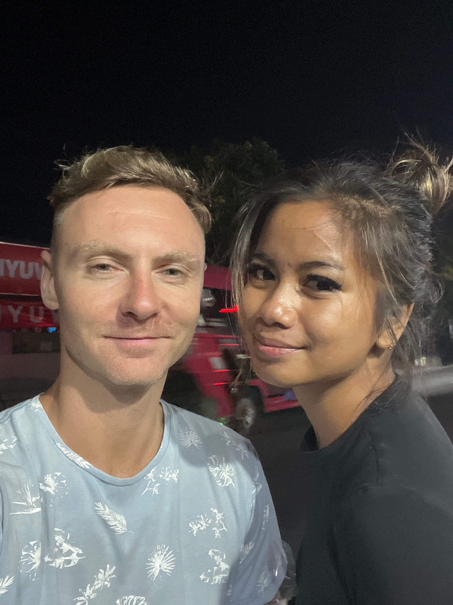 The image shows a selfie of two people, a man and a woman, taken at night. The man is in the foreground and is fair-skinned with blonde hair. He's wearing a light blue t-shirt with a white botanical p…read more
