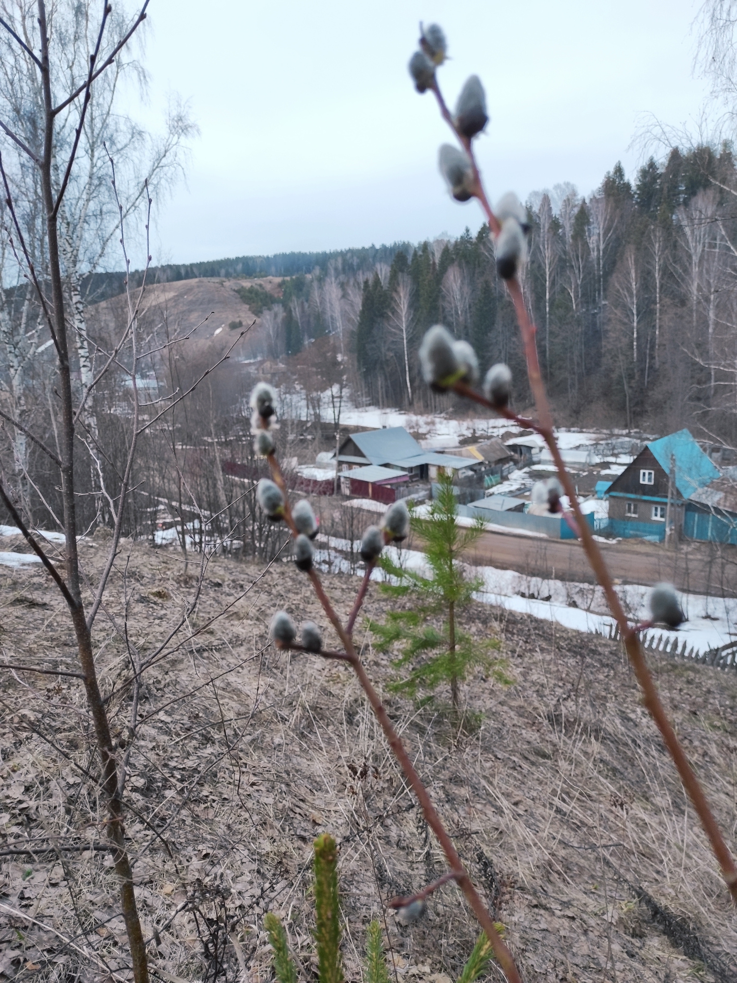 The image depicts a close-up view of willow branches with catkins in the foreground, with a village scene in the background. The background shows houses with visible roofs and architecture, suggesting…read more