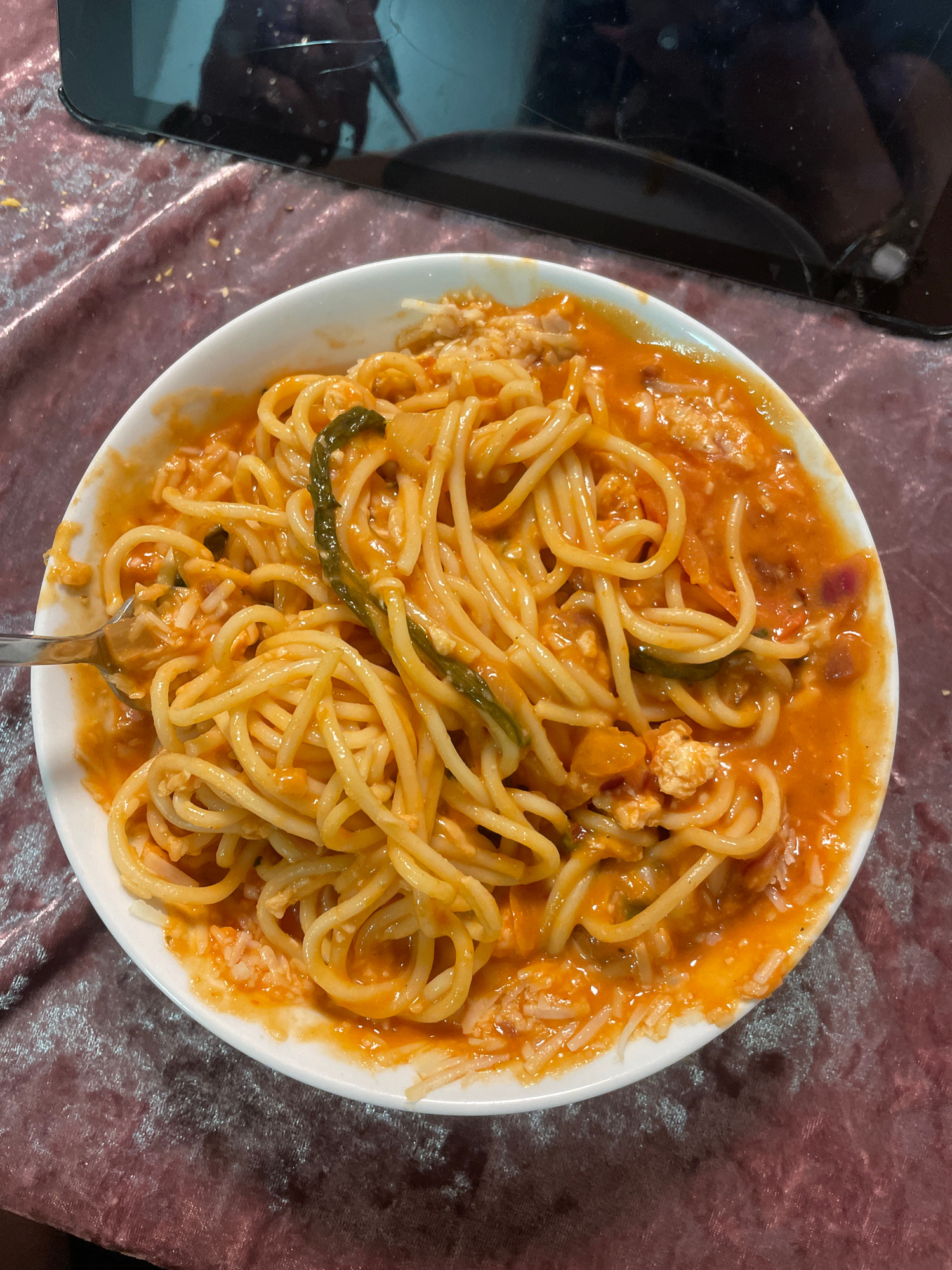 A top-down view of a white plate filled with spaghetti and a tomato-based sauce, garnished with what appears to be shredded cheese and some green vegetables. A fork is visible in the lower part of the…read more