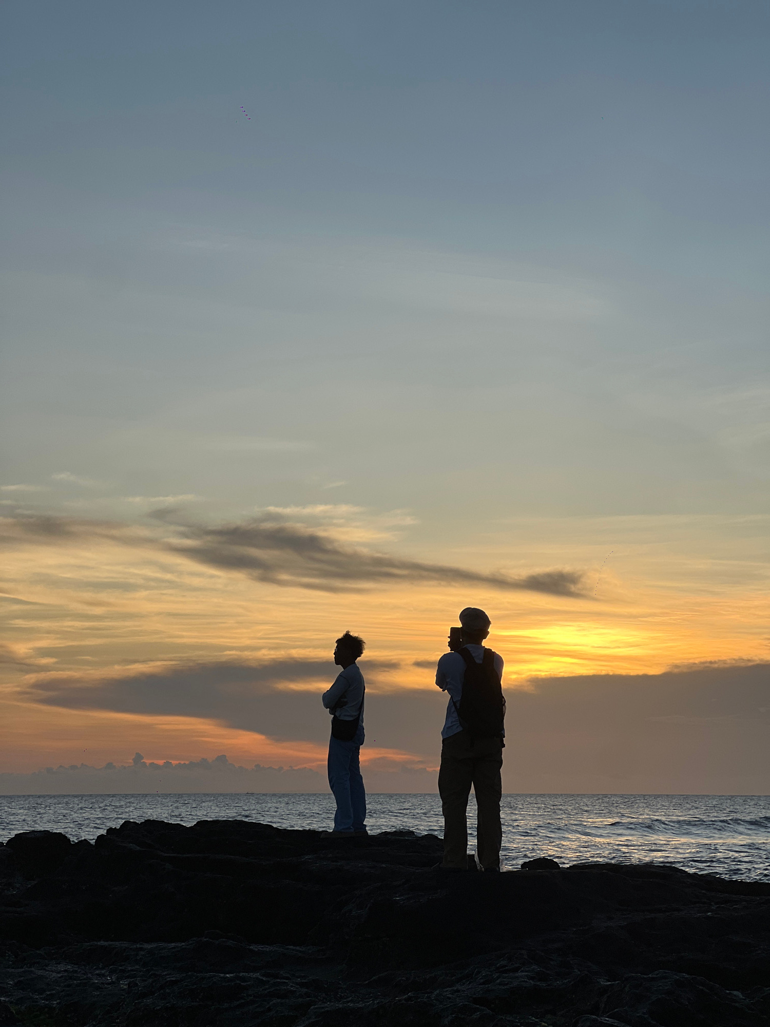 Two people are standing on a dark, rocky outcropping next to a body of water, likely the ocean. The sky is a mix of blue and orange hues, indicating either sunrise or sunset. The figures are silhouett…read more