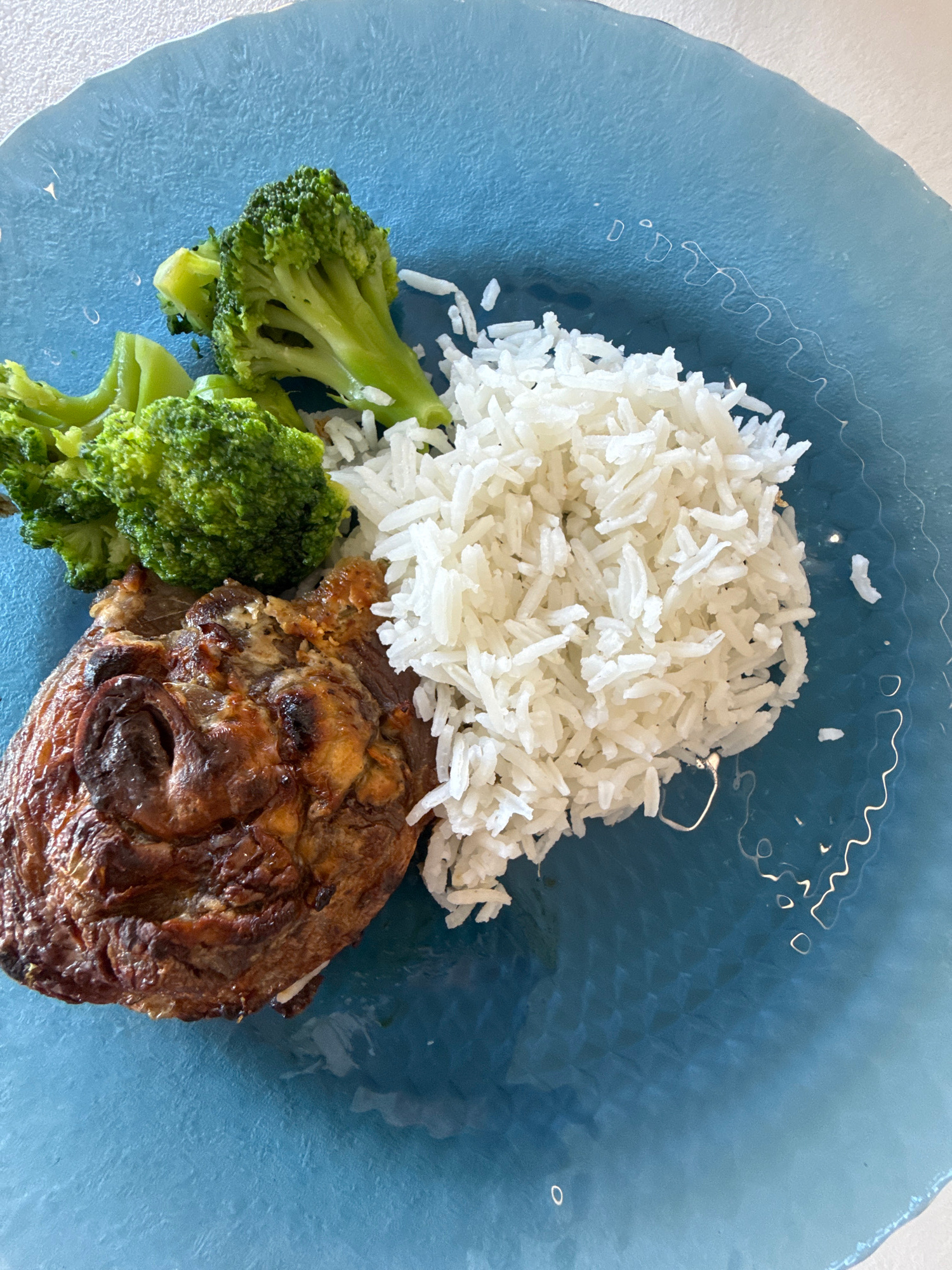 A blue plate holds a serving of white rice, broccoli florets, and a piece of browned meat. The image is taken in a close-up, overhead shot. There is no indication of the location being in Votkinsk, Ru…read more