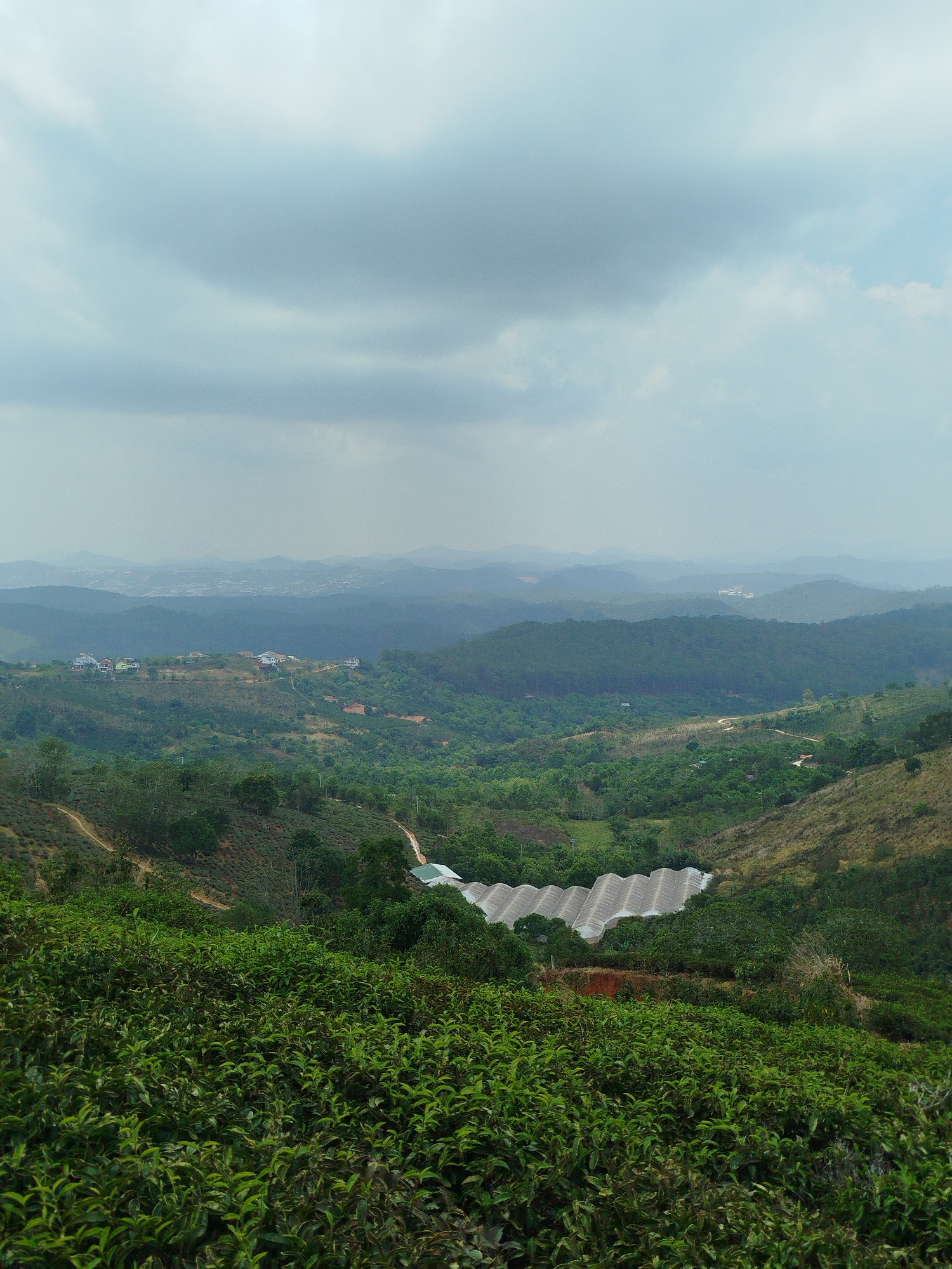 The image depicts a landscape in Trường Thọ, Vietnam, featuring layered hills and valleys under an overcast sky. In the foreground is a dense, green tea plantation. Further down the slope, a large, wh…read more