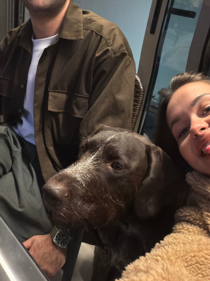 A rotated selfie shows a woman with a visible tongue, wearing a fuzzy tan jacket. Beside her is a brown, short-haired dog with white around its snout and chin. A person wearing a green jacket over a w…read more