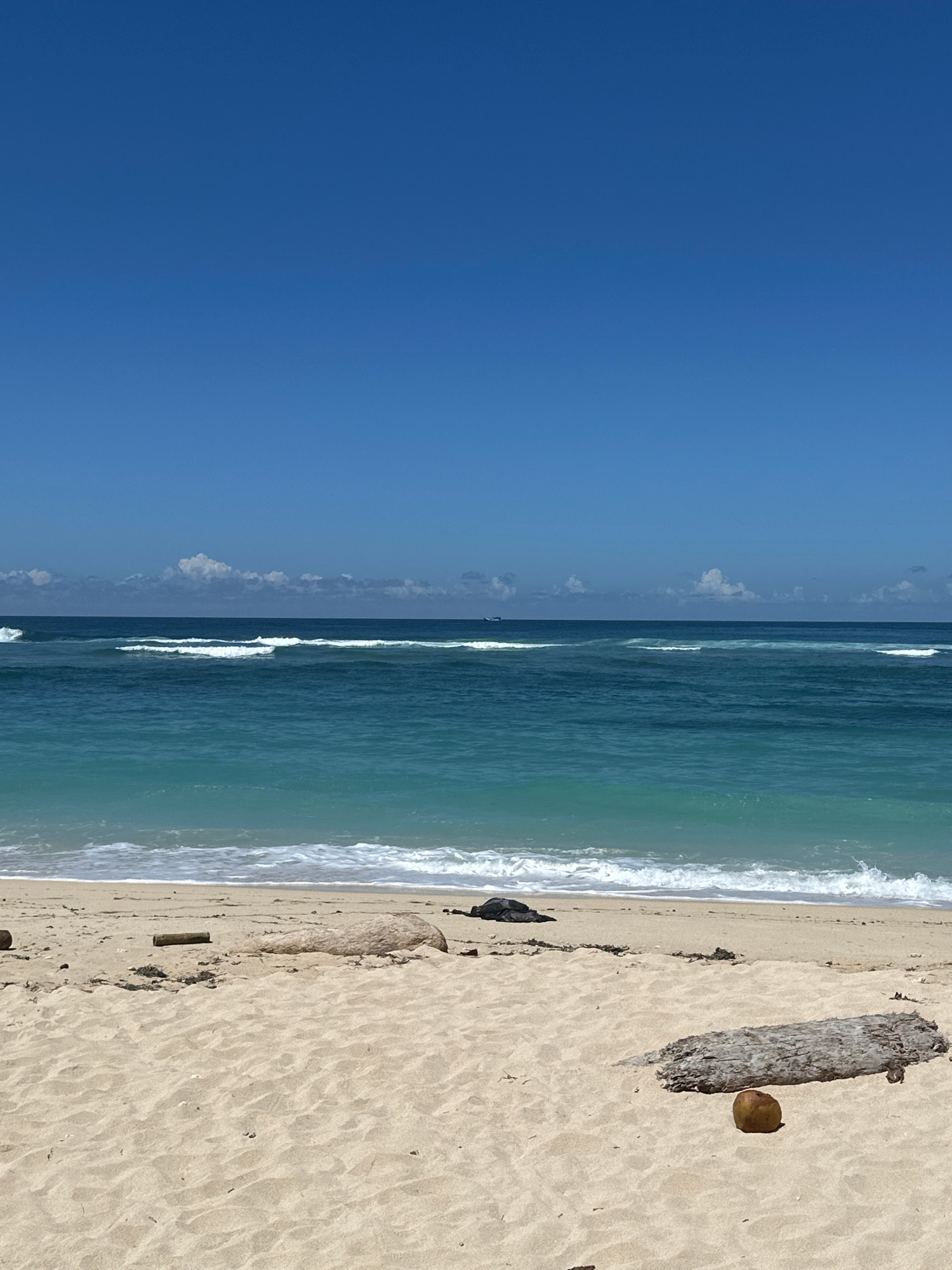 The image displays a serene beach landscape under a clear, bright blue sky. The scene is composed of three horizontal sections when viewed correctly: a vast sky, the ocean, and a sandy beach. The upp…read more