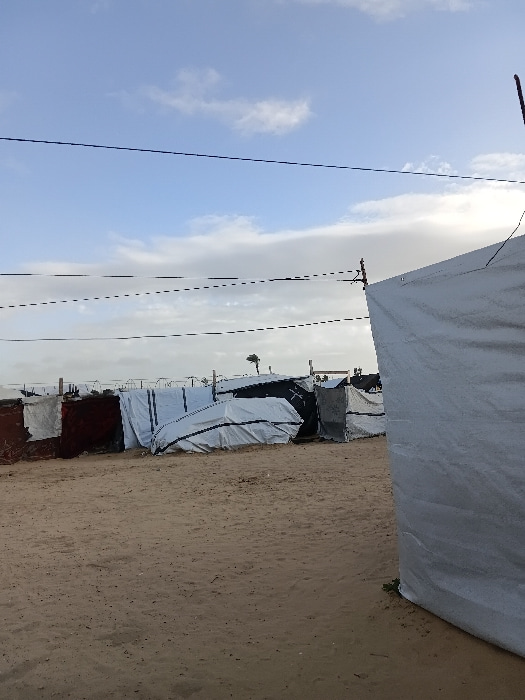 A line of tents stretches into the distance under a cloudy sky. The tents are primarily white, some appearing darker, and are pitched on sandy ground. Overhead power lines crisscross the sky. The view…read more