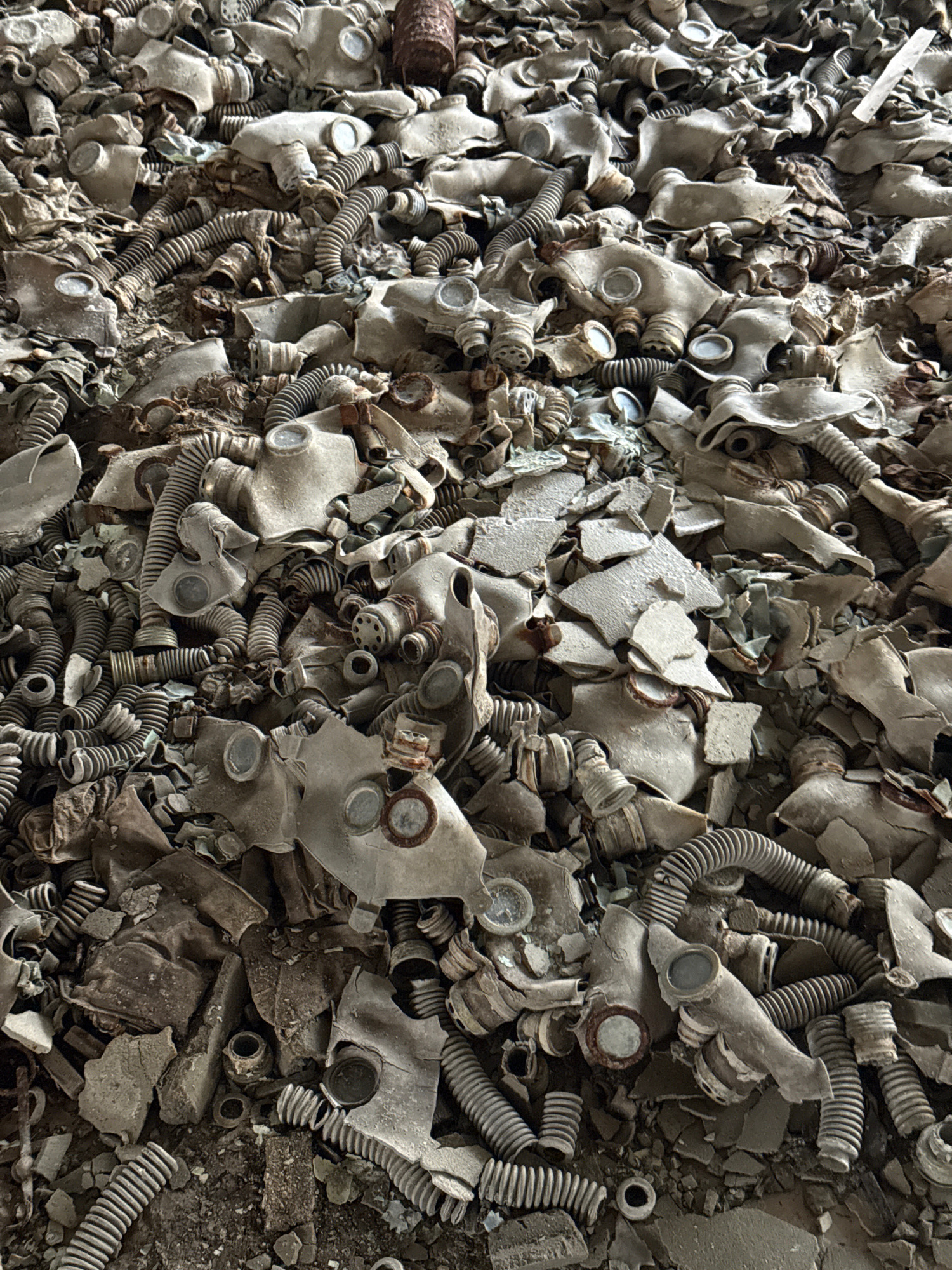 The image depicts a dense pile of discarded and broken gas masks in what appears to be an interior space. The masks are predominantly gray and appear aged or damaged, with visible signs of wear, crack…read more