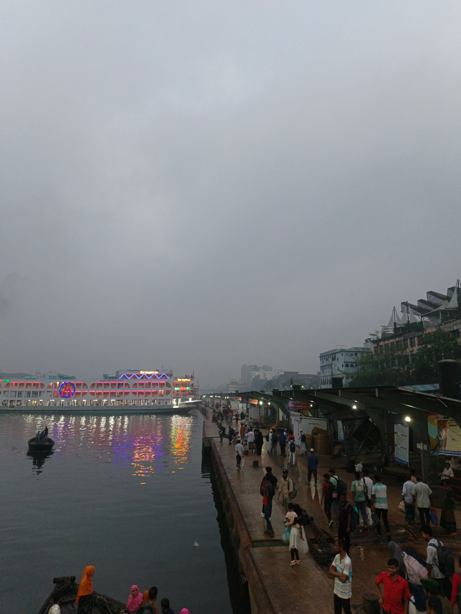 The image depicts a riverside scene in Dhaka, Bangladesh, likely near Sadarghat, a major river port on the Buriganga River. It's overcast, suggesting either early morning or a cloudy day. A large pass…read more