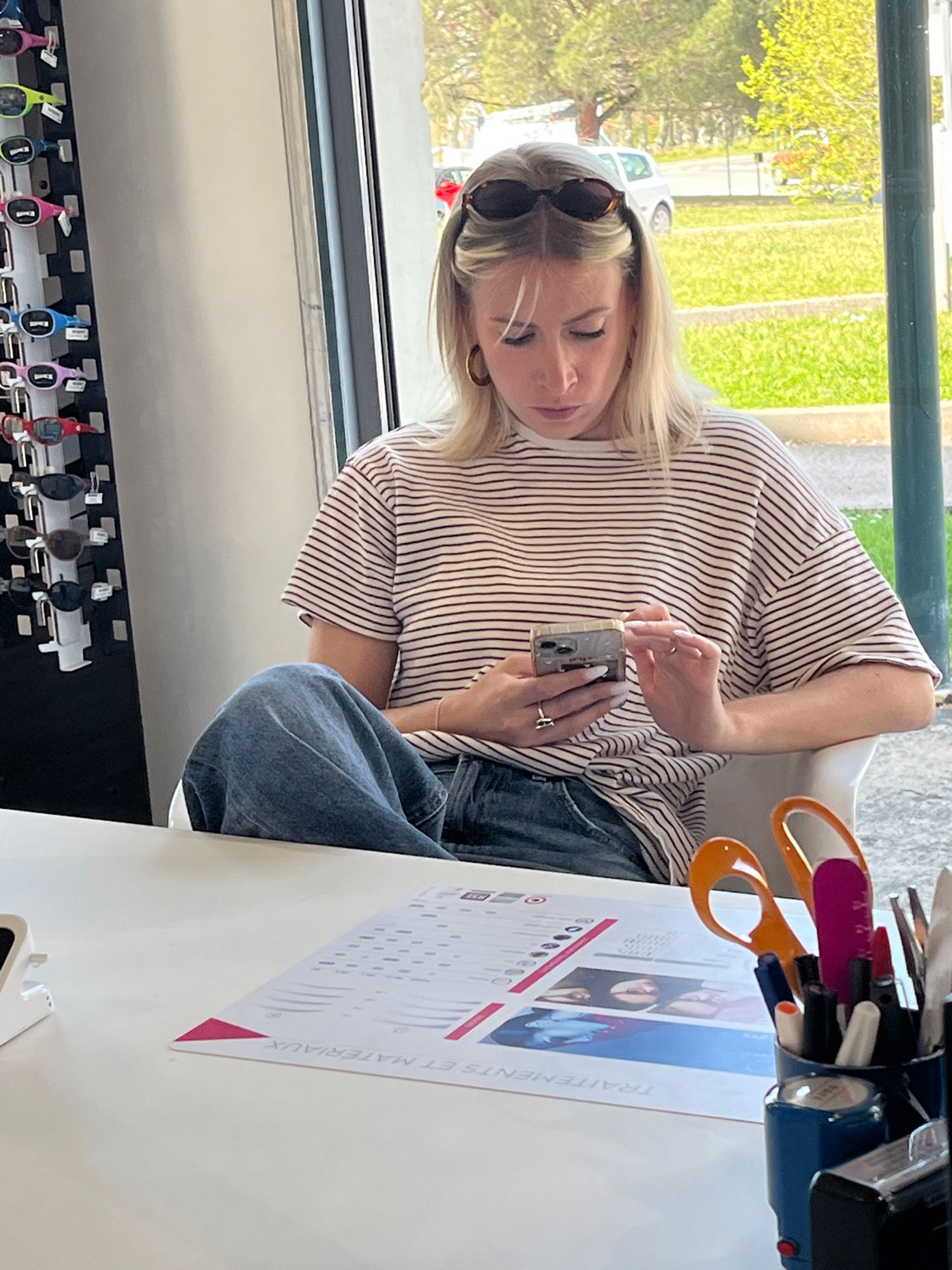 The image captures a blonde woman indoors, seated at a white table, engrossed in her smartphone. She wears a white and brown striped short-sleeved shirt and blue jeans, with sunglasses perched on herβ¦read more