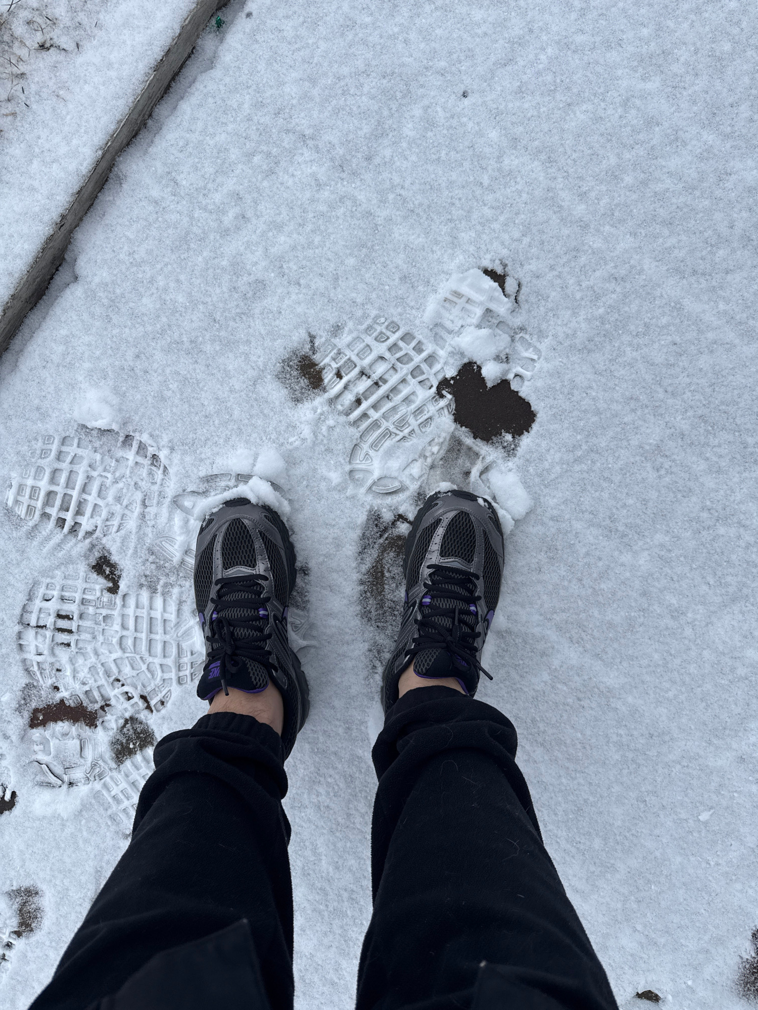 The image shows a person standing in snow. The person is wearing black pants and grey and purple running shoes. There are footprints in the snow, both from the person's shoes and previous prints. Ther…read more