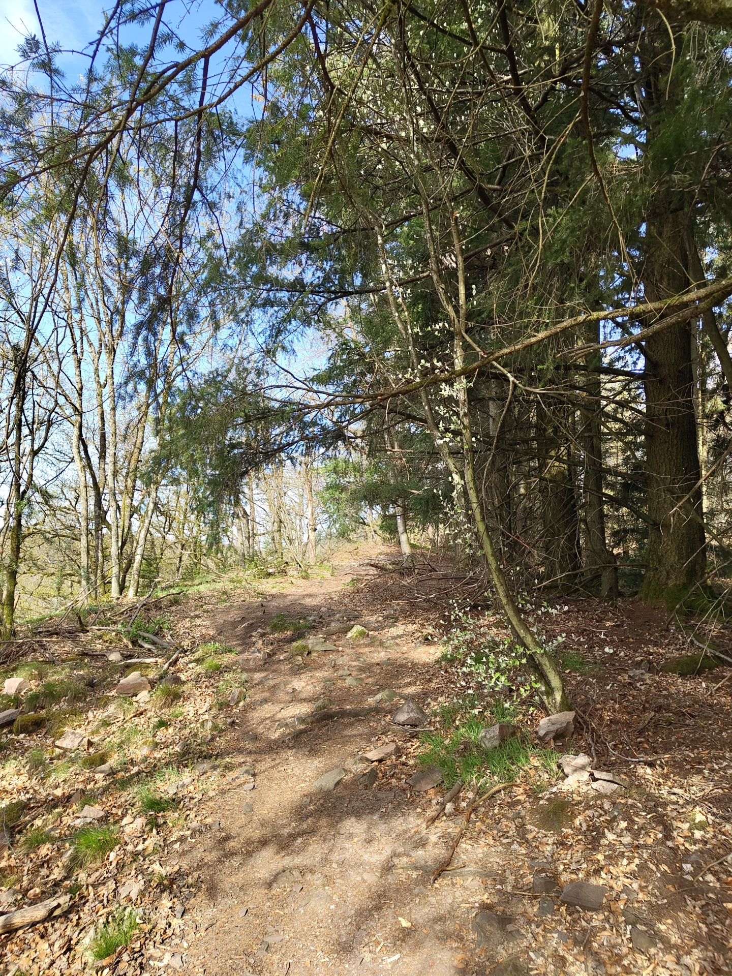The image depicts a forest path in Mettlach, Germany. The path is covered in dirt, fallen leaves, rocks, and patches of green grass. The edges of the path are overgrown with foliage and some ivy. A th…read more
