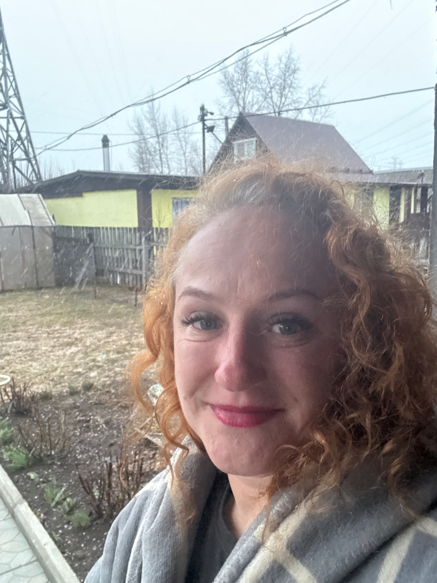 A selfie of a woman with curly red hair, light skin, and red lipstick, wearing a gray and white patterned blanket. She is facing the camera with a slight smile. The background shows a cloudy day with…read more