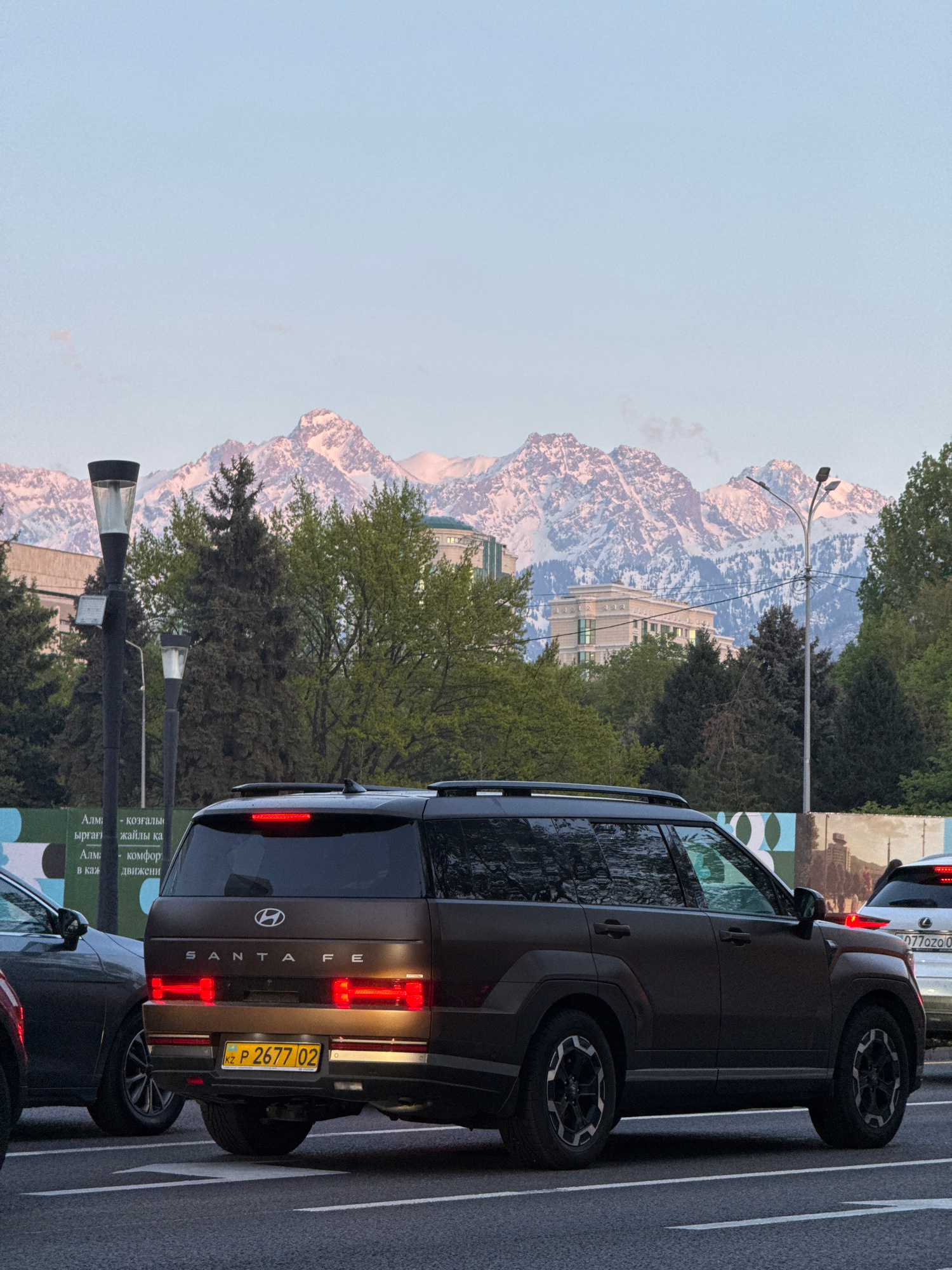An outdoor photograph captures an urban street scene in Almaty, Kazakhstan, with majestic snow-capped mountains in the background. In the foreground, a dark-colored Hyundai Santa Fe SUV is prominentl…read more