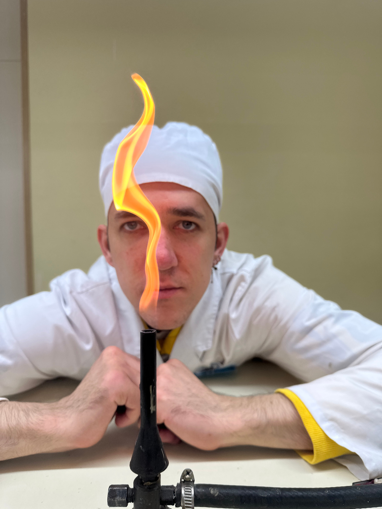 A man wearing a white chef's hat and white jacket with yellow trim is holding a lit gas burner. The background is a plain wall. I cannot determine the location in Saratov, Russia from this image.