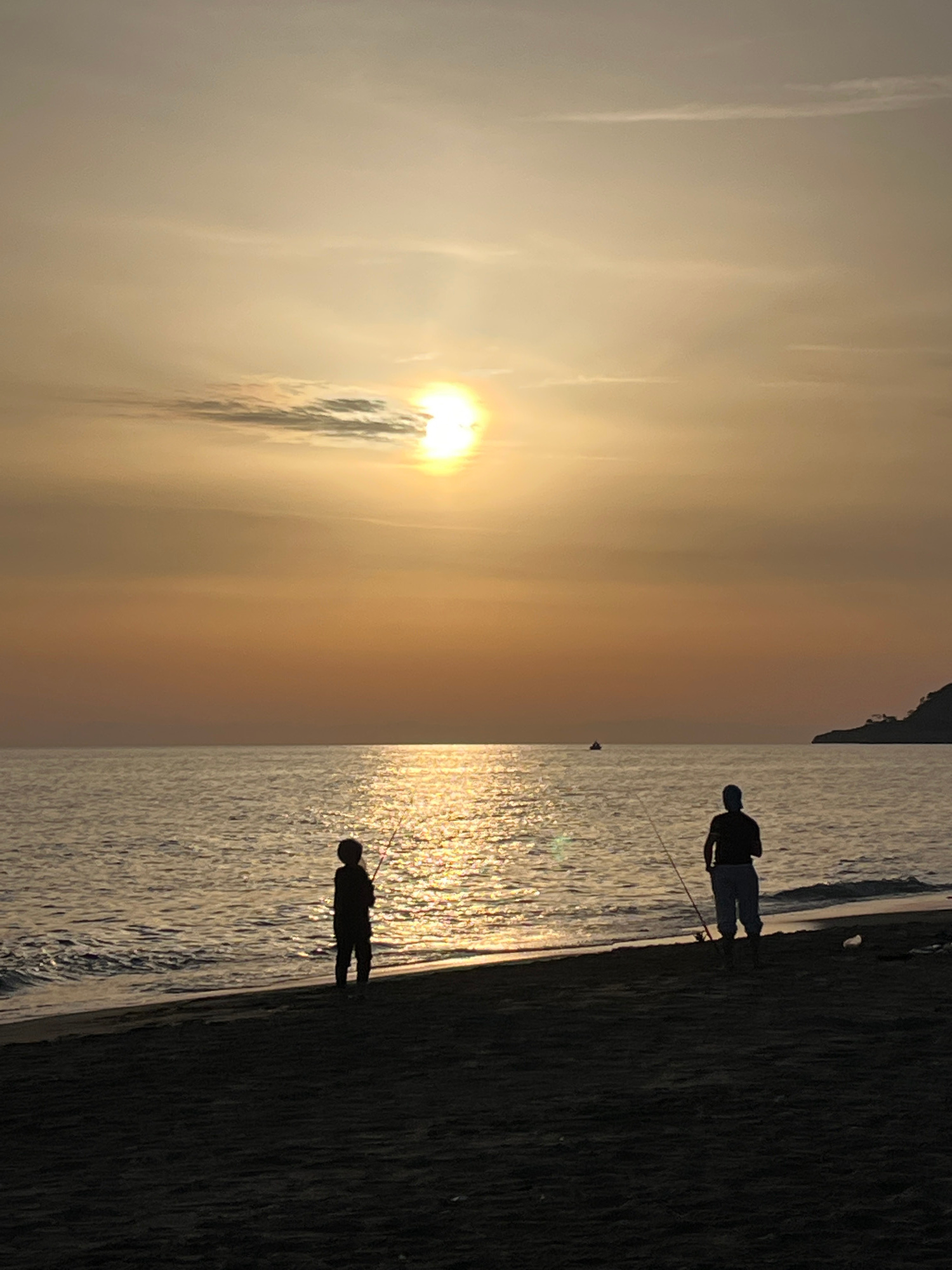 Two people are fishing in the sea at sunset. The sun is setting on the horizon, casting a warm glow over the water. The silhouettes of the people are visible against the bright background. The locatio…read more