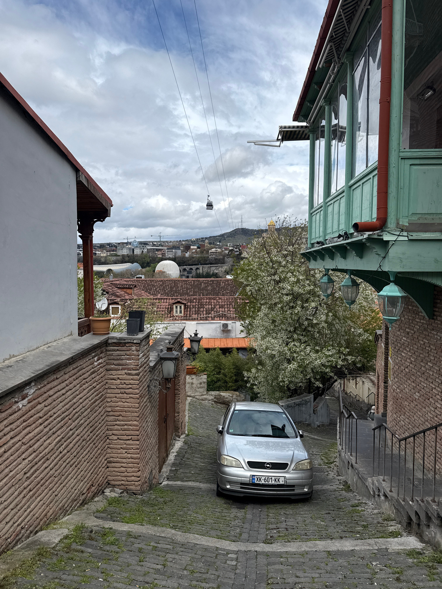 The image shows a narrow street in Tbilisi, Georgia. The street is paved with cobblestones and slopes downward. A silver car is parked on the street. Buildings on either side are made of brick and woo…read more