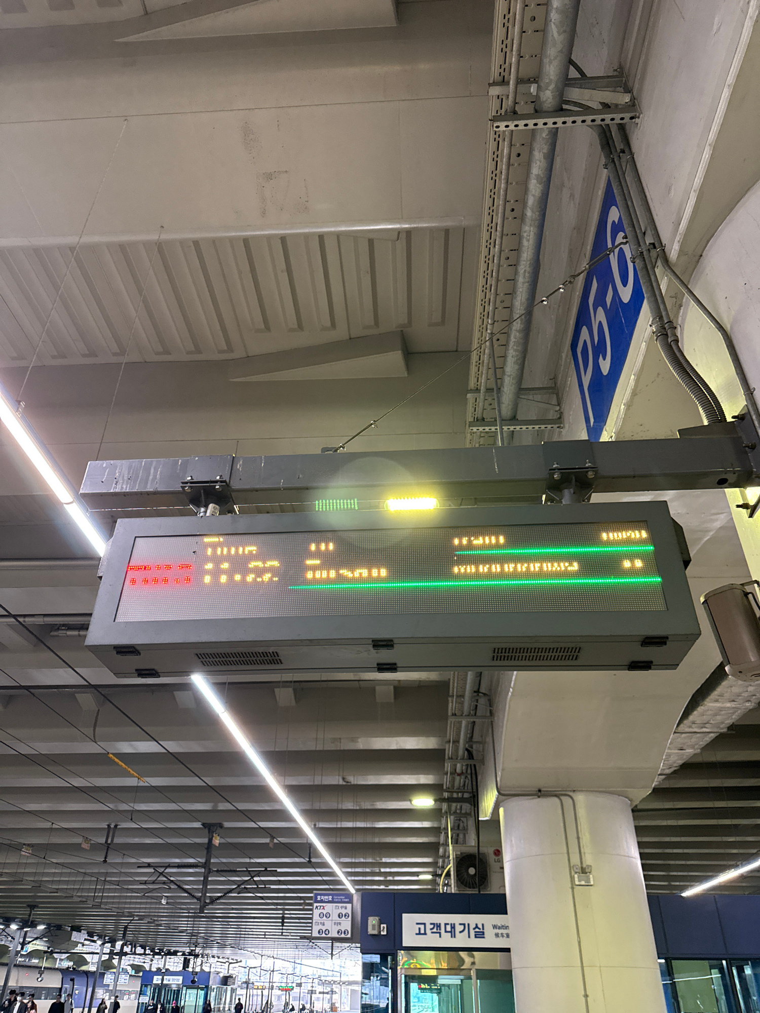 The image captures an indoor scene, likely within a transportation hub, in Daegu, South Korea. A ceiling-mounted sign with a blue plate displaying "P5-G" hangs overhead, along with various pipes and c…read more