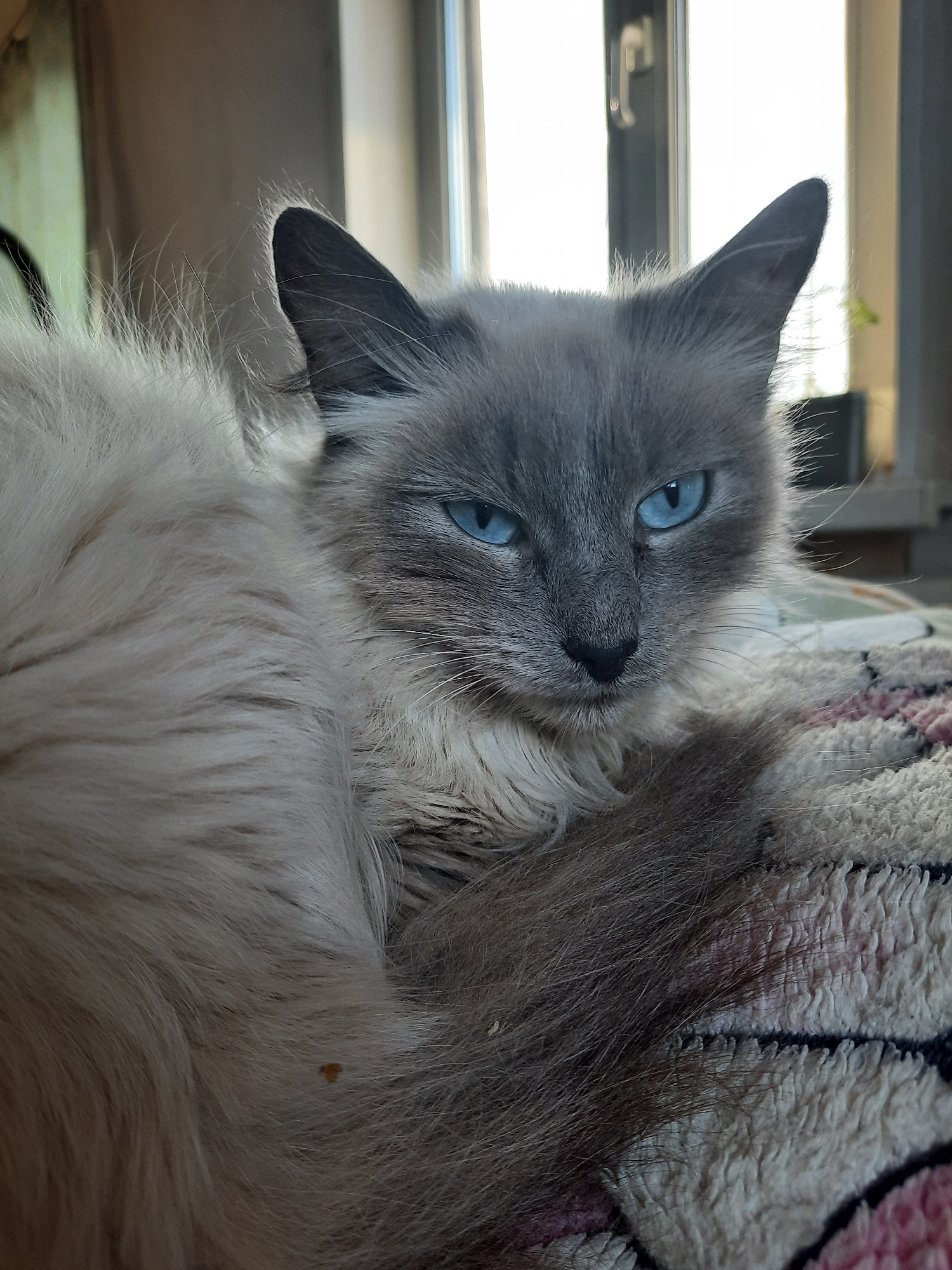 A close-up photograph depicts a blue-eyed cat, possibly a Ragdoll or Birman breed, lying on what appears to be a patterned blanket or fabric. The cat's fur is primarily light cream color on its body w…read more