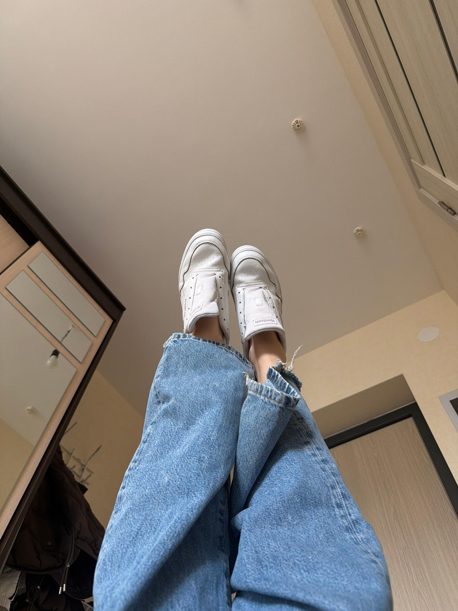 The image shows a person's legs and feet in a seemingly indoor setting. The person is wearing light blue jeans with frayed hems and white sneakers, which appear to be Reebok brand. The background show…read more