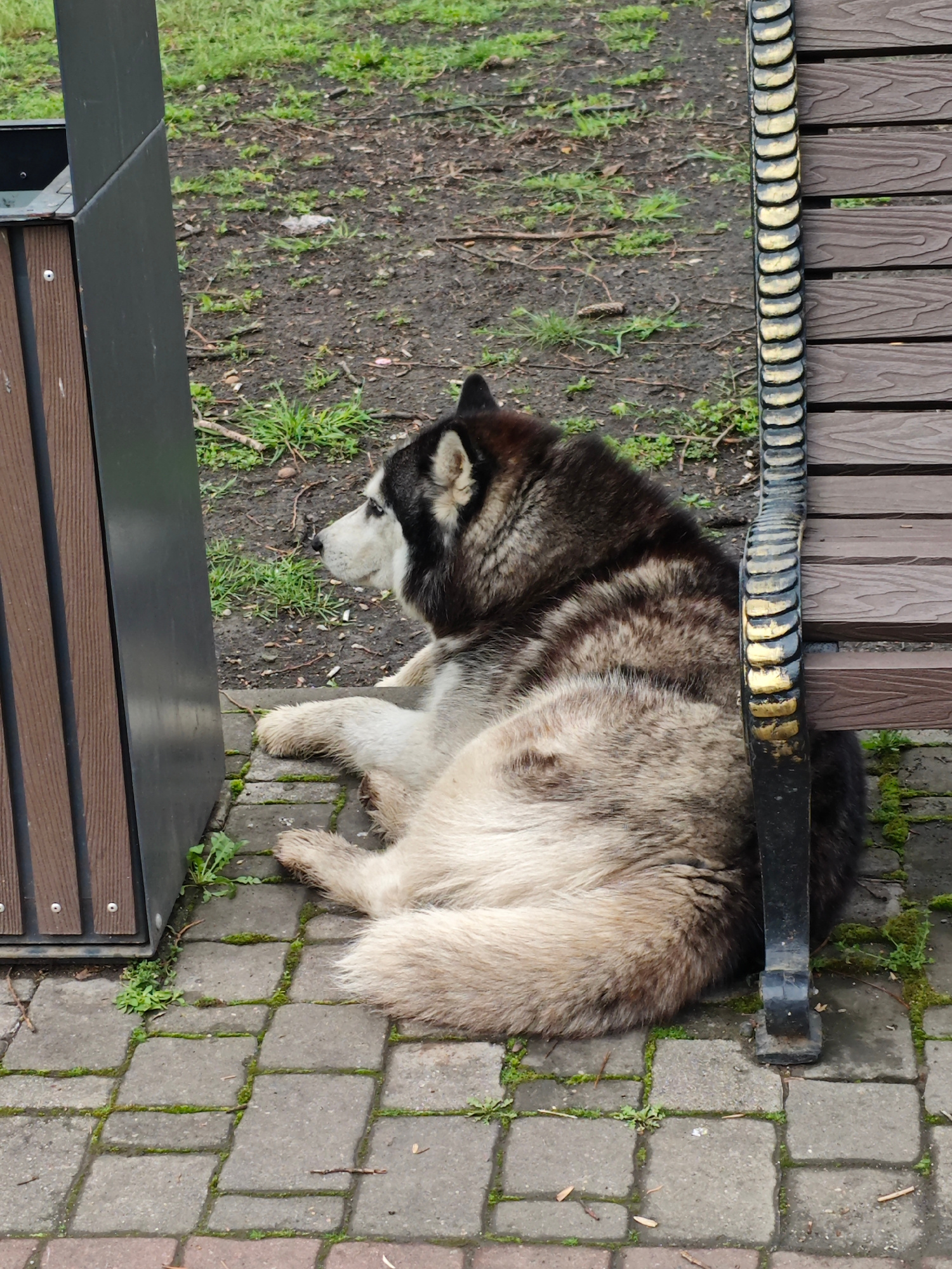 A husky lies on a paved surface, adjacent to a dark brown bench and trash bin. The husky has black and white fur on its head and a mix of light brown and gray fur on its body. The bench is made of dar…read more