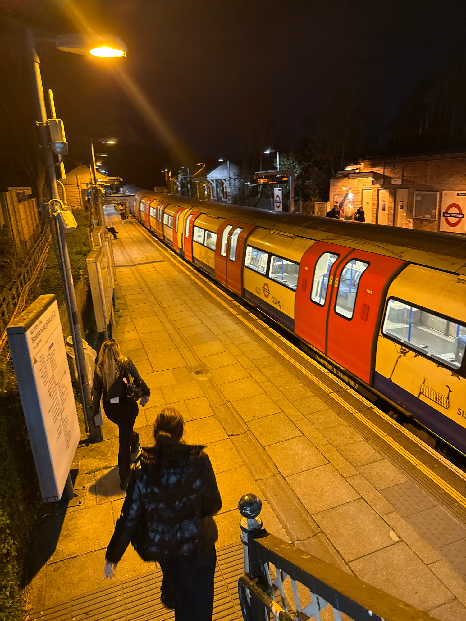 The image shows a platform at the West Finchley Underground station in London, United Kingdom, at night. An orange and white London Underground train is stopped at the platform. Two individuals are wa…read more