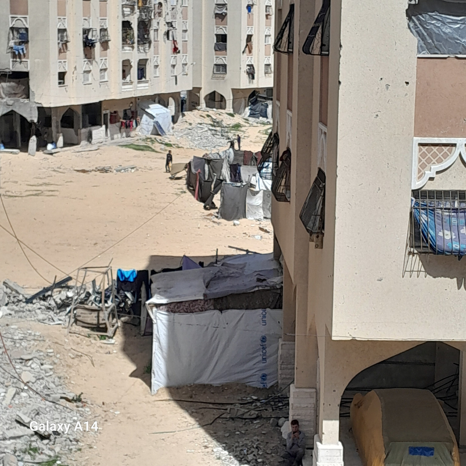 The image depicts an urban residential area in Khan Yunis, Palestinian Territory, characterized by significant destruction and makeshift living arrangements. The scene is viewed from an elevated positβ¦read more