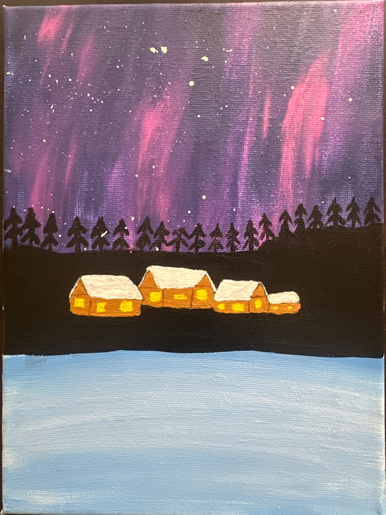 The image is a painting on canvas depicting a surreal landscape. On the left, a pink and purple nebulous sky with white speckles representing stars is visible. Adjacent to the sky, a line of silhouett…read more