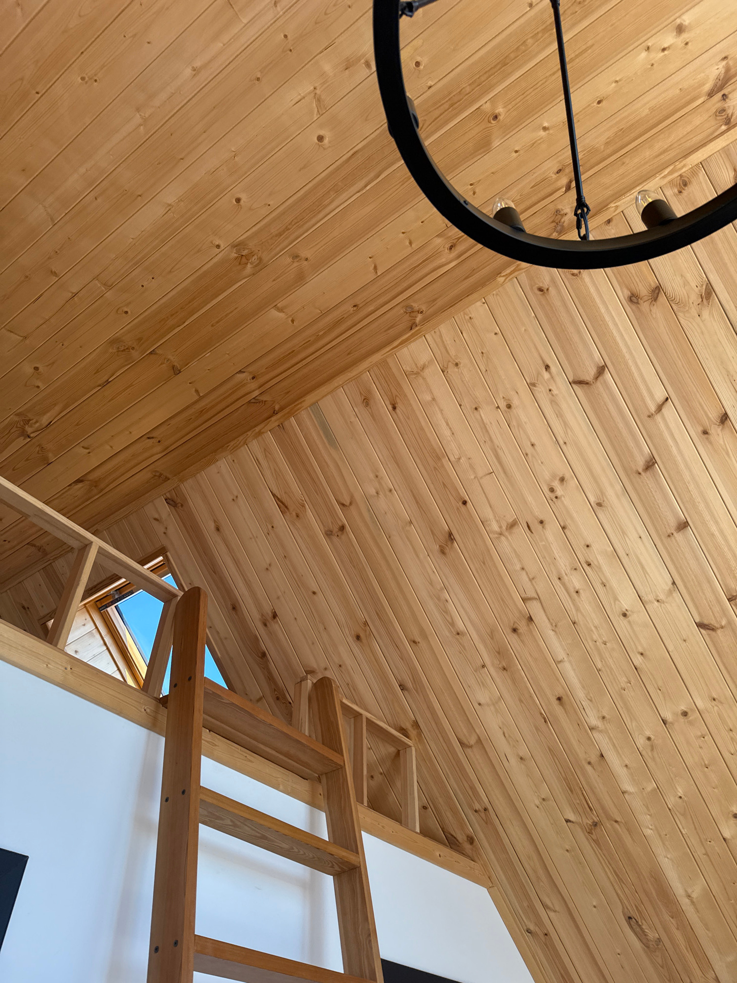 The image displays the interior architecture of a building, characterized by extensive use of light-colored wood. The dominant feature is a pitched ceiling and adjacent wall surfaces clad in diagonal…read more