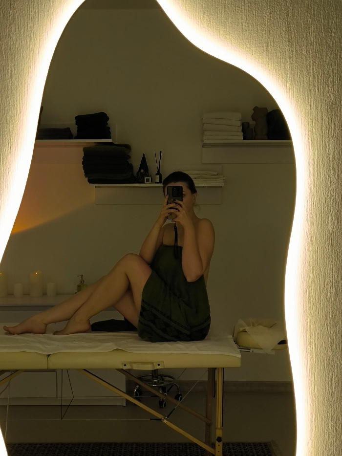 The image depicts the reflection of a female individual taking a photograph of herself in an irregularly shaped, backlit mirror within what appears to be a spa or massage therapy room in Vinnytsia, Uk…read more