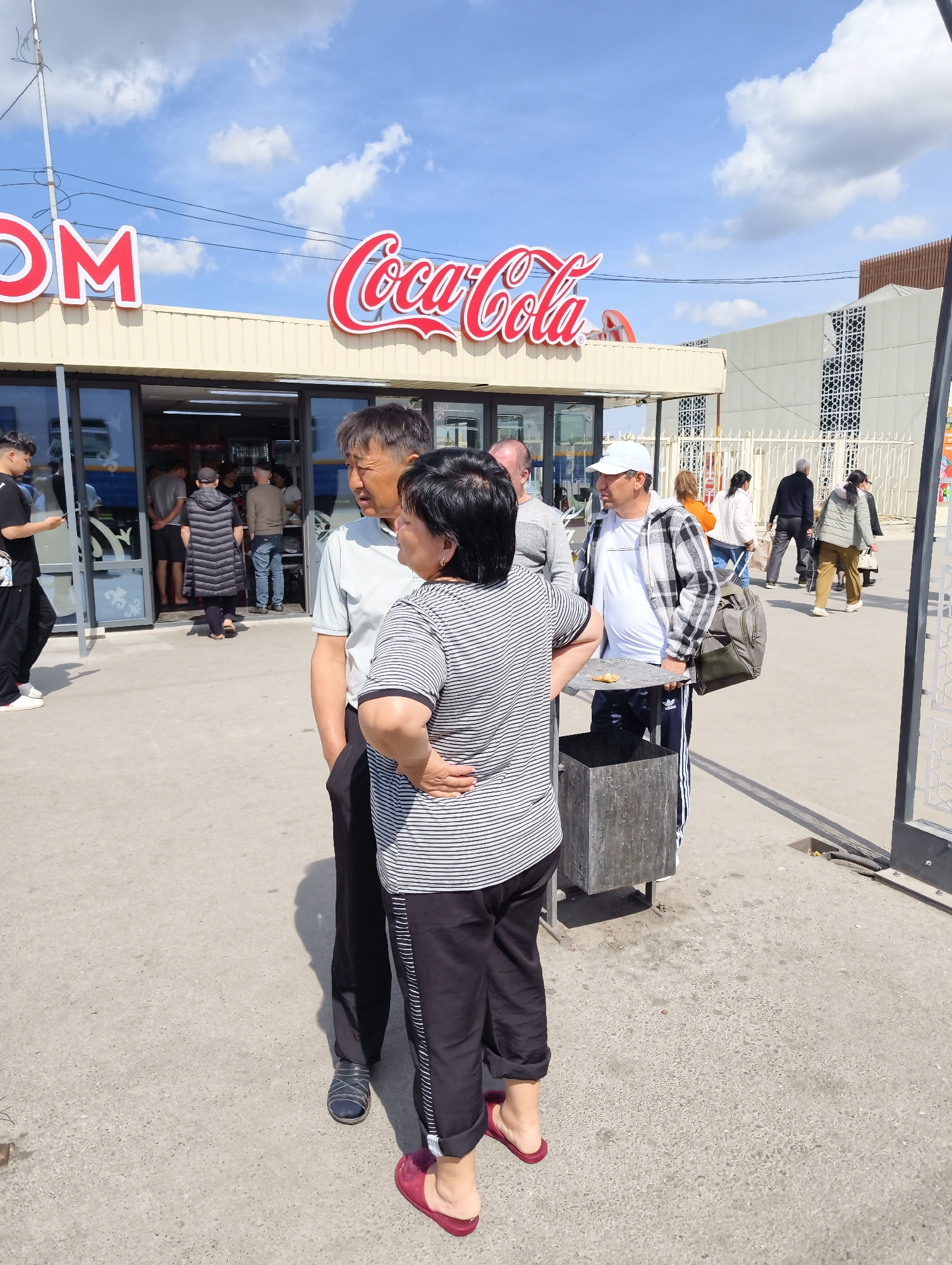 The image captures a daytime scene in what appears to be Shymkent, Kazakhstan. A middle-aged Asian couple stands in the foreground. The man wears a light green shirt and dark pants, while the woman is…read more