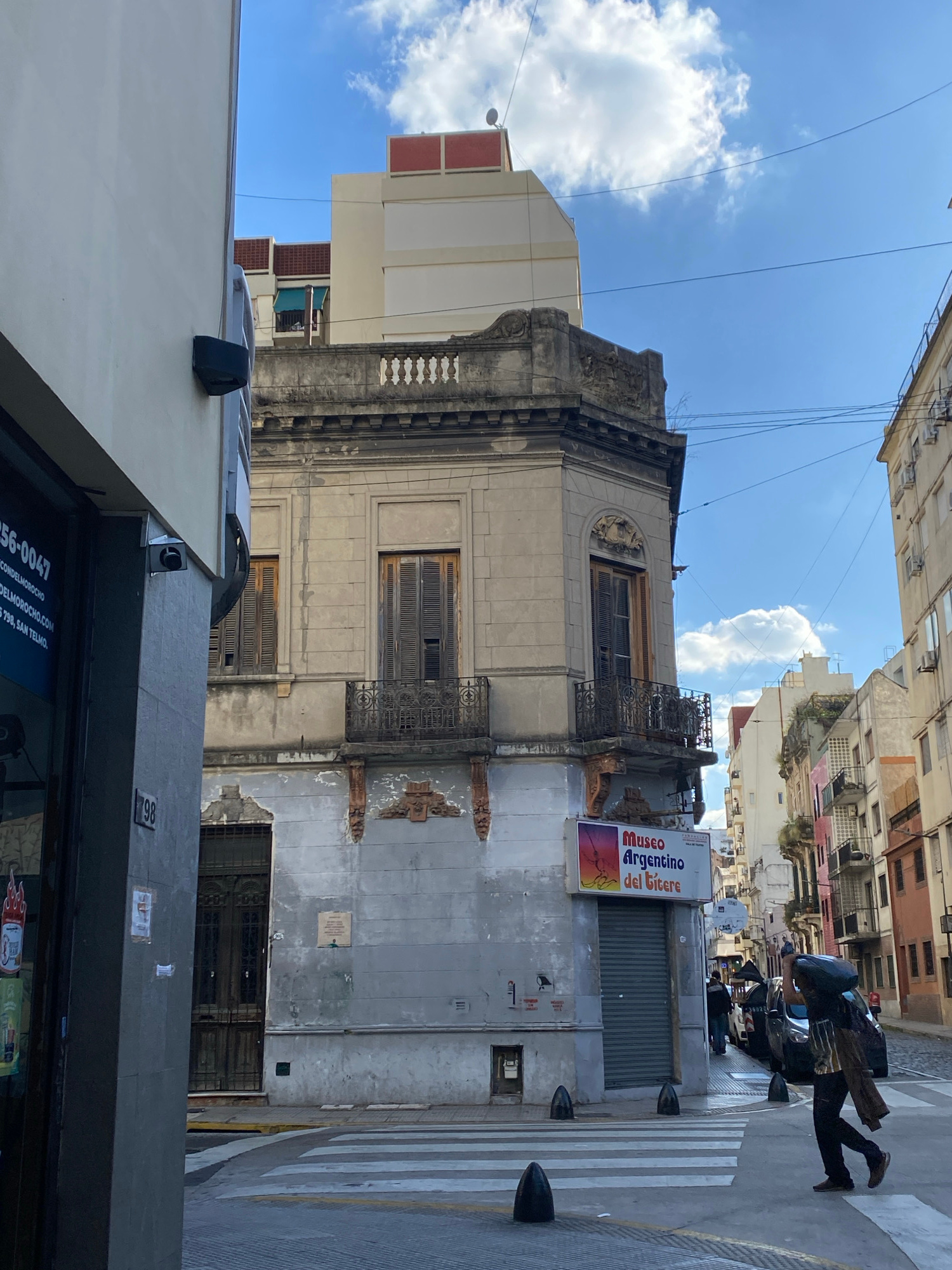 A street scene in Buenos Aires, Argentina. A narrow street view shows buildings on either side. On the right, a building with a partially damaged facade is visible; it has a closed roll-up door with t…read more