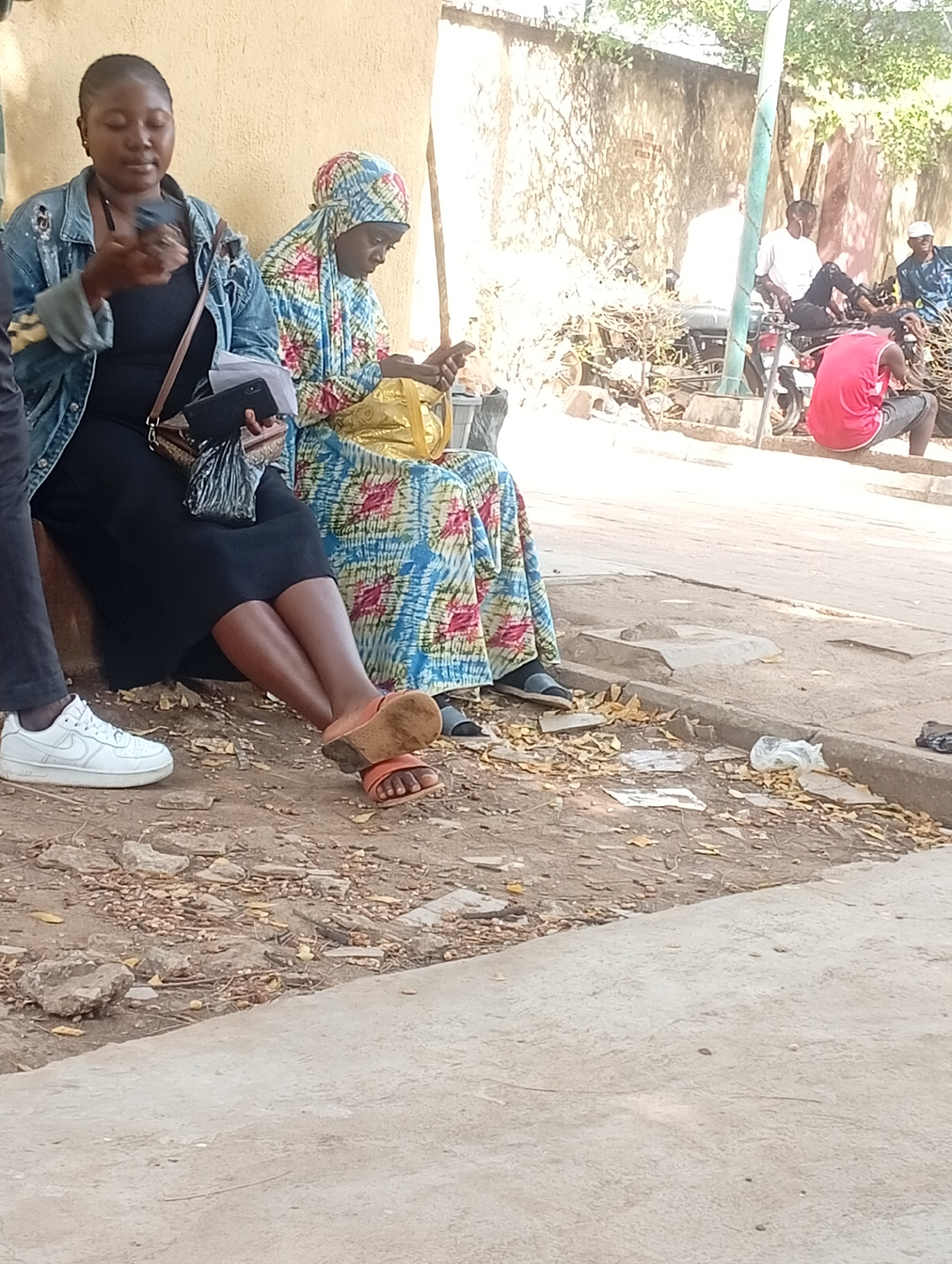 This image captures an outdoor scene in Barden Yana, Nigeria, featuring a group of people in a casual, dusty environment during daylight hours. In the foreground, two women are seated. The woman on t…read more