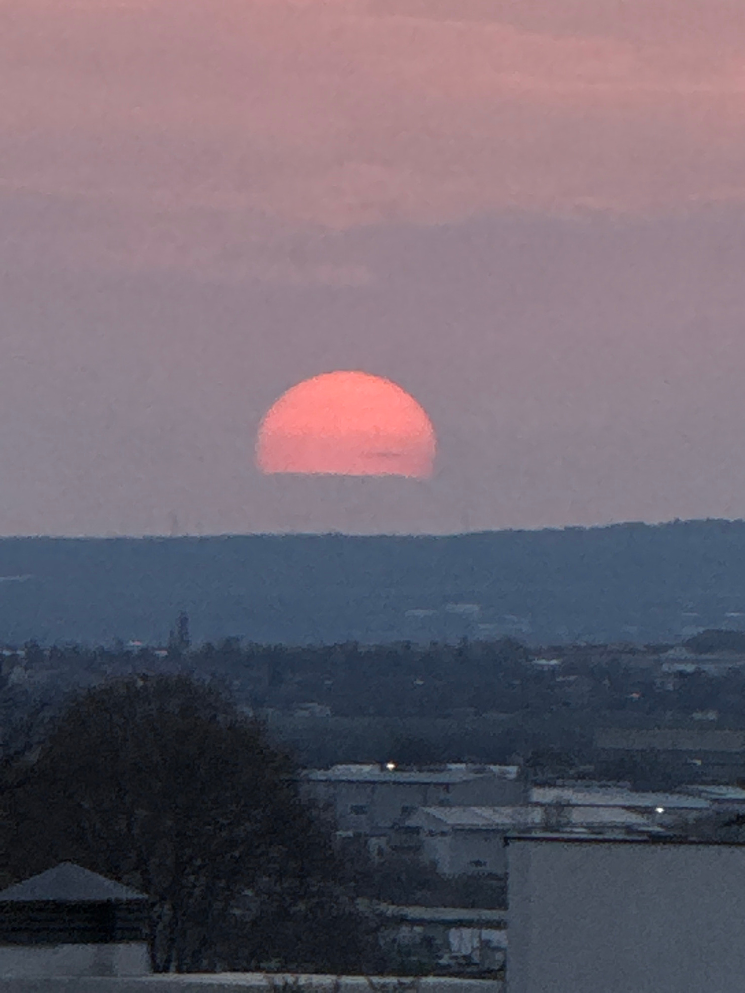 The image shows a half-obscured sun, orange-red in color, appearing on the left side of the frame. To the right of the sun, there is a dark, obscured landscape, possibly a cityscape. A partial buildin…read more