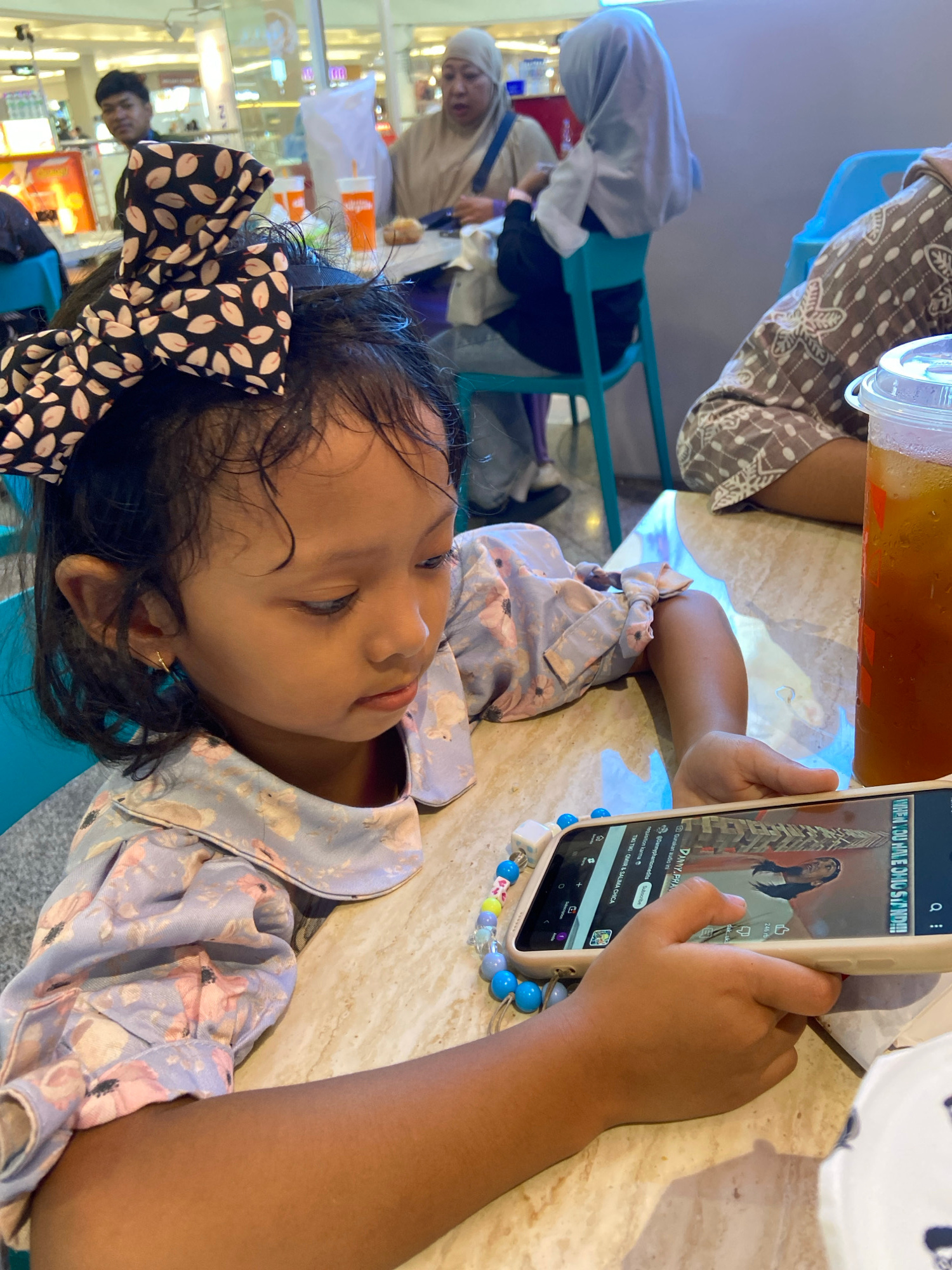 An intimate, candid image captures a young child lying on a light-colored table, fully engrossed in watching a video on a smartphone in an indoor public setting, likely a cafe or food court in Surabay…read more