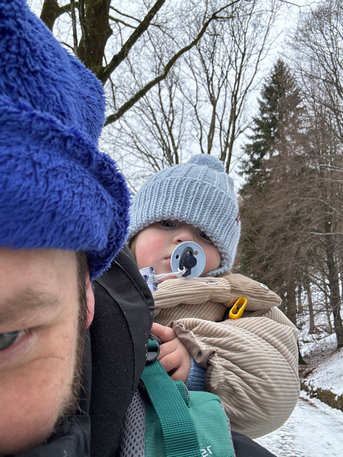 A close-up, angled shot shows a baby wearing a light blue knit hat and a pacifier, nestled against someone in a blue fleece. The baby is wearing a beige corduroy jacket and has their hand resting on a…read more