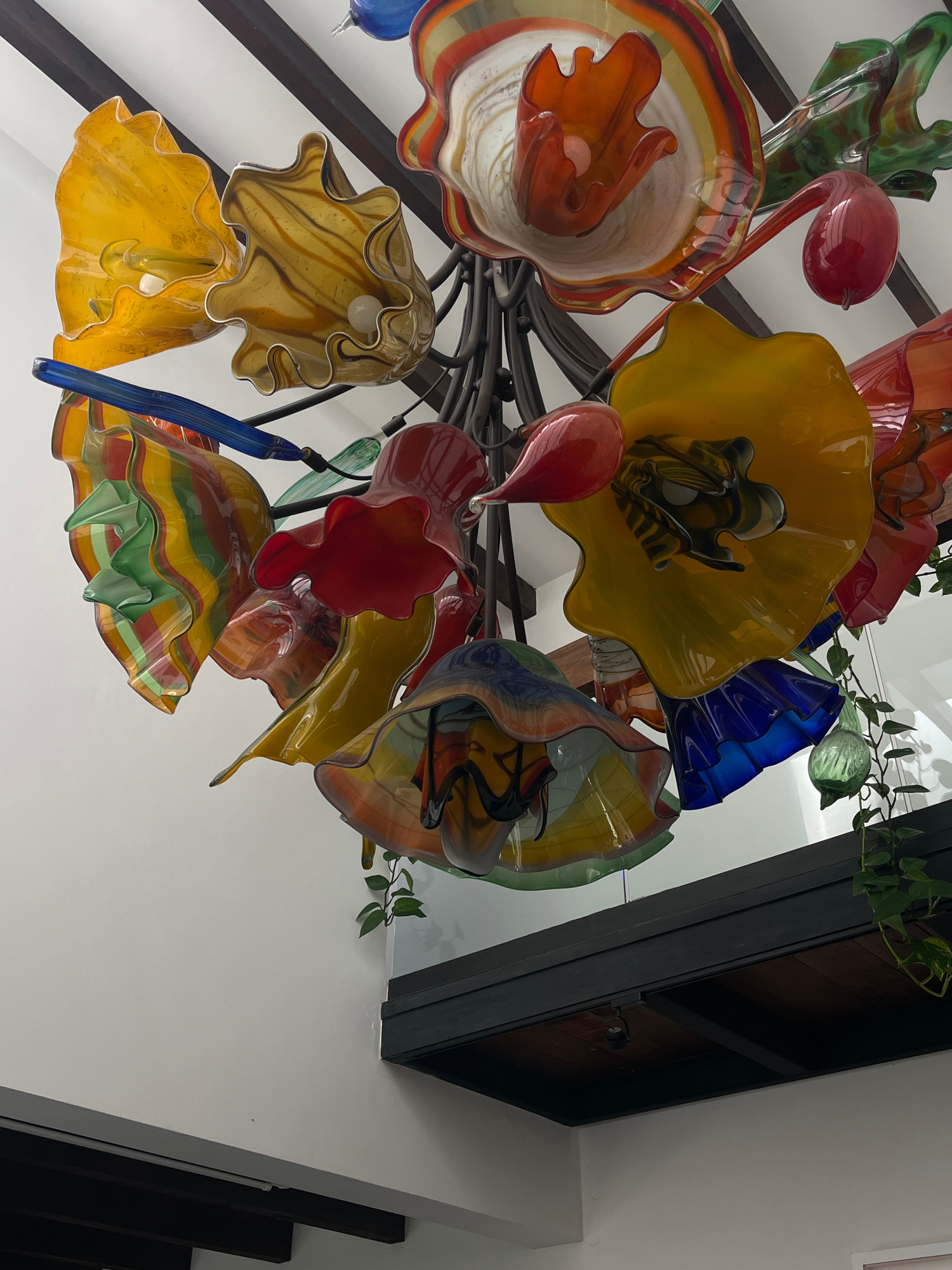 A low-angle shot captures a colorful, blown-glass chandelier resembling flowers, mounted on a wrought-iron frame against a white ceiling. The glass flowers exhibit various colors including yellow, red…read more
