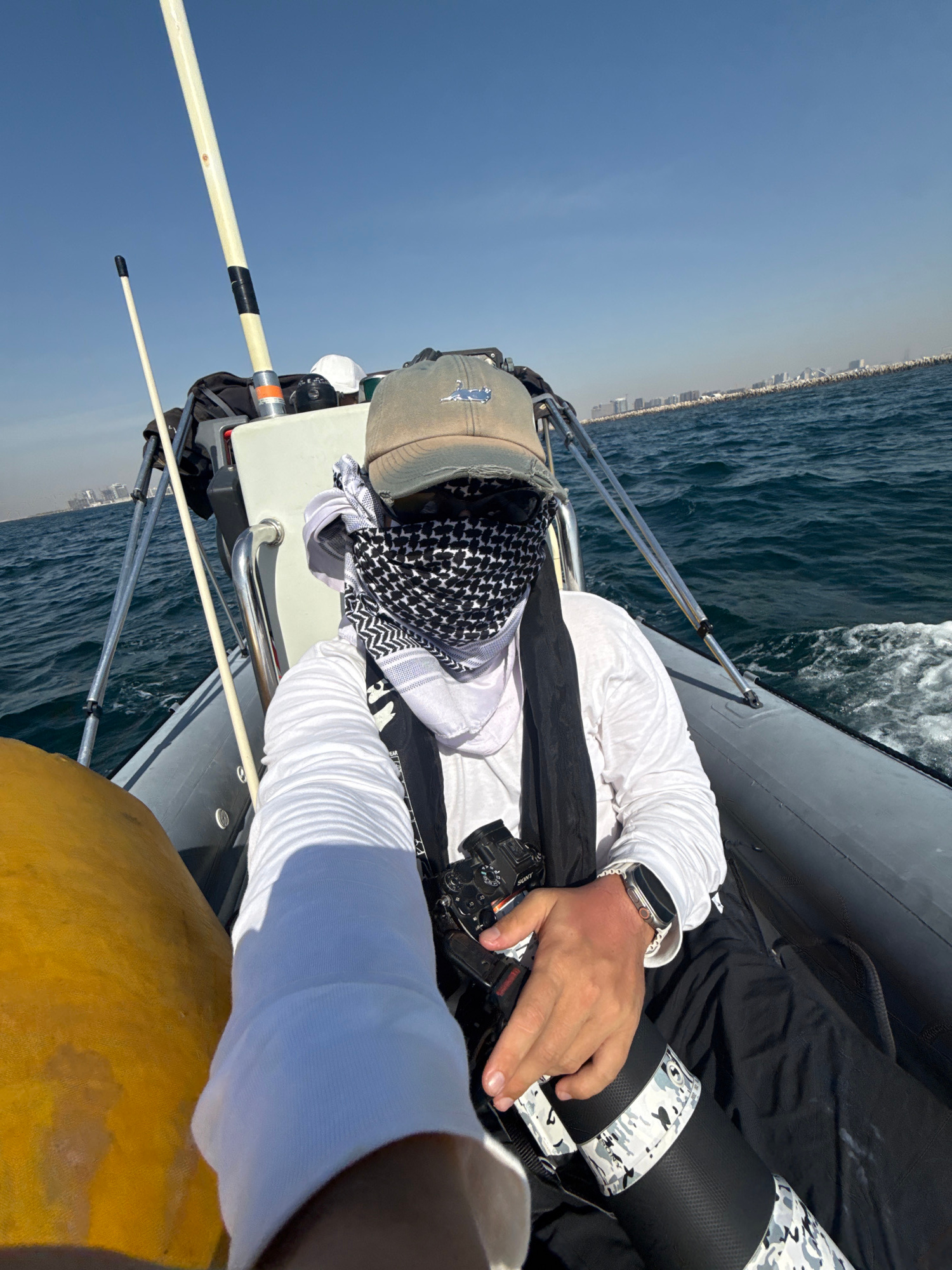 A man is on a boat at sea. He is wearing a black and white keffiyeh, a white long-sleeved shirt, and a silver Apple Watch. He is holding a black camera. The boat has gray inflatable sides and metal ra…read more