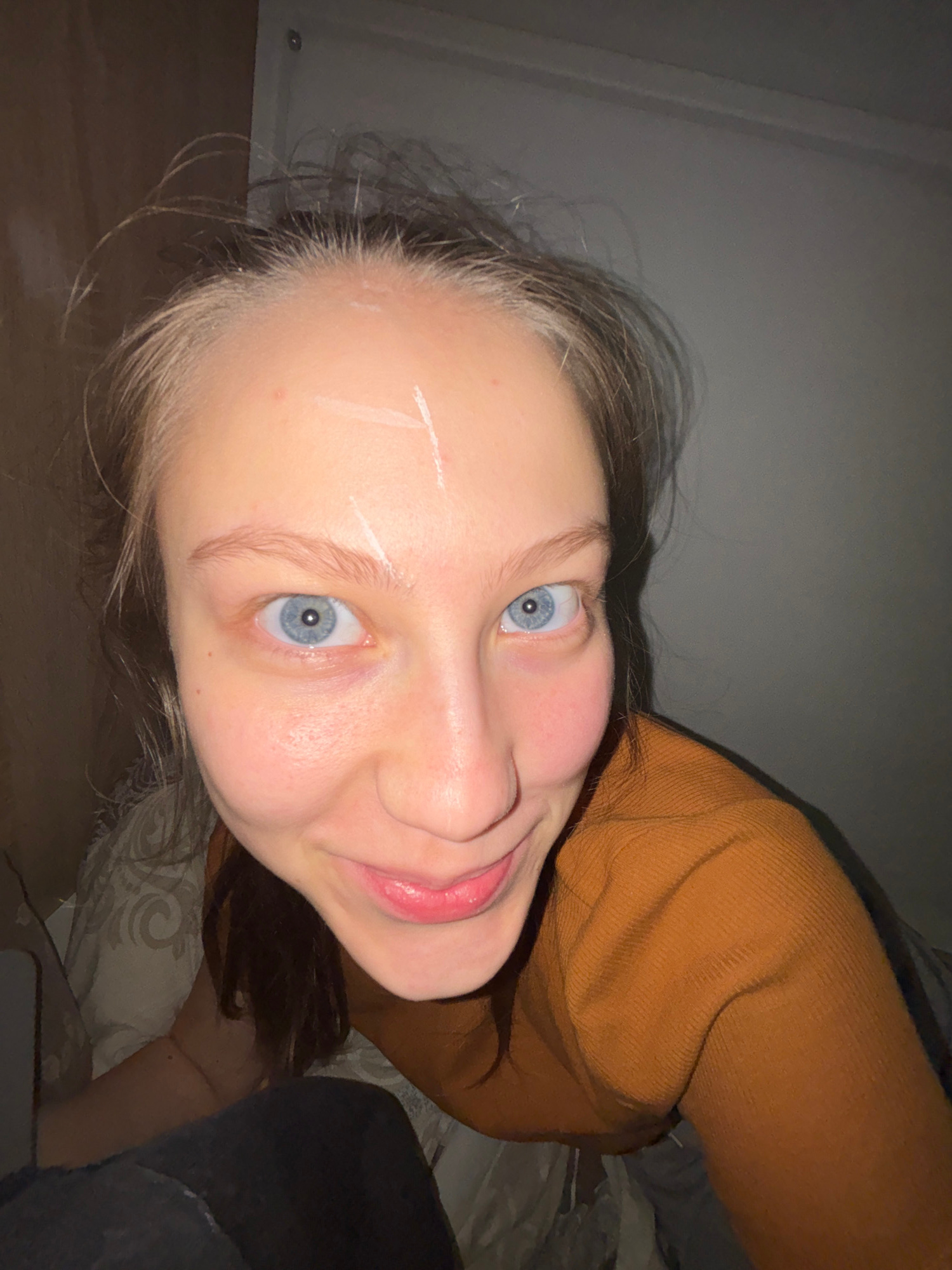A person is lying down, oriented with their head towards the upper left corner and their body extending diagonally towards the lower right. The person has fair skin, light blonde hair with darker root…read more