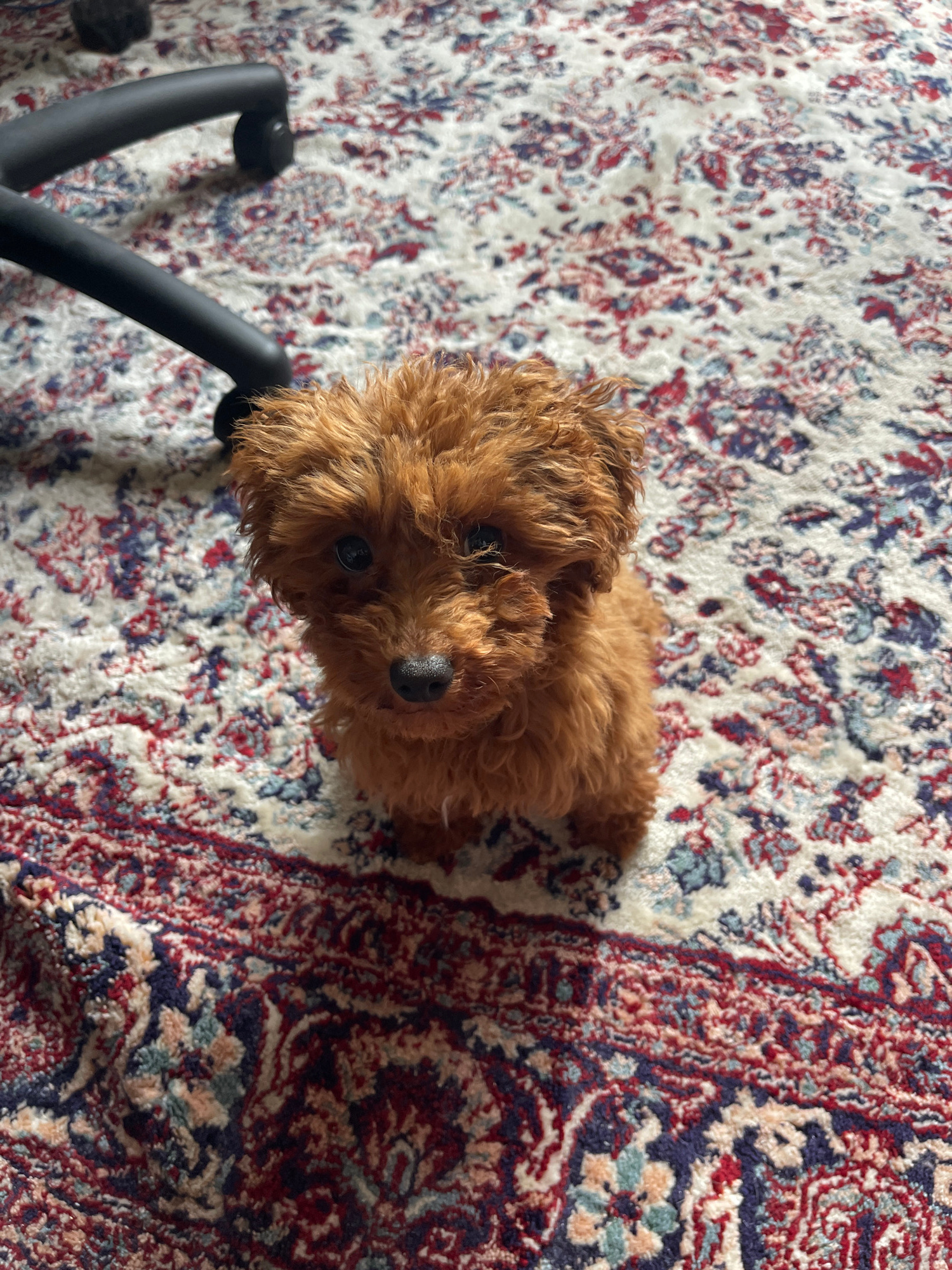 A small, fluffy, light brown dog with dark eyes and a black nose is the central subject, looking directly up at the camera. Its curly fur suggests it might be a Toy Poodle or a similar breed. The dog…read more