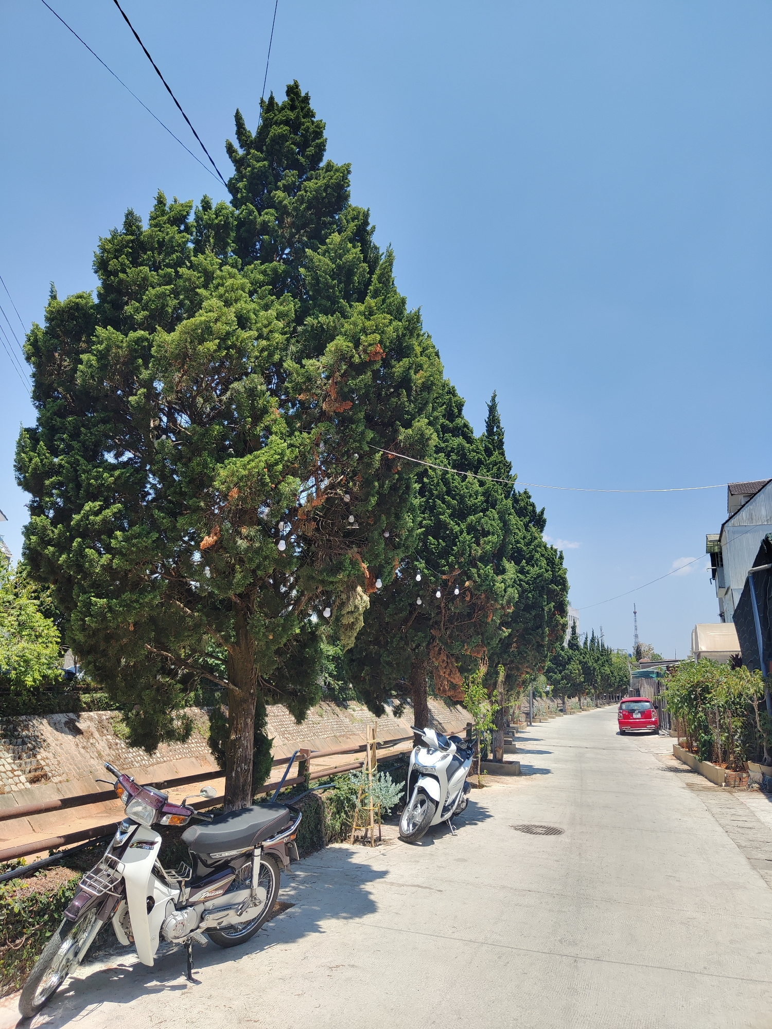 The image depicts a street scene in Cam Ly, Đà Lạt, Vietnam. A line of tall, mature trees flanks the left side of the concrete road. String lights hang amidst the foliage of one of the trees. Two moto…read more