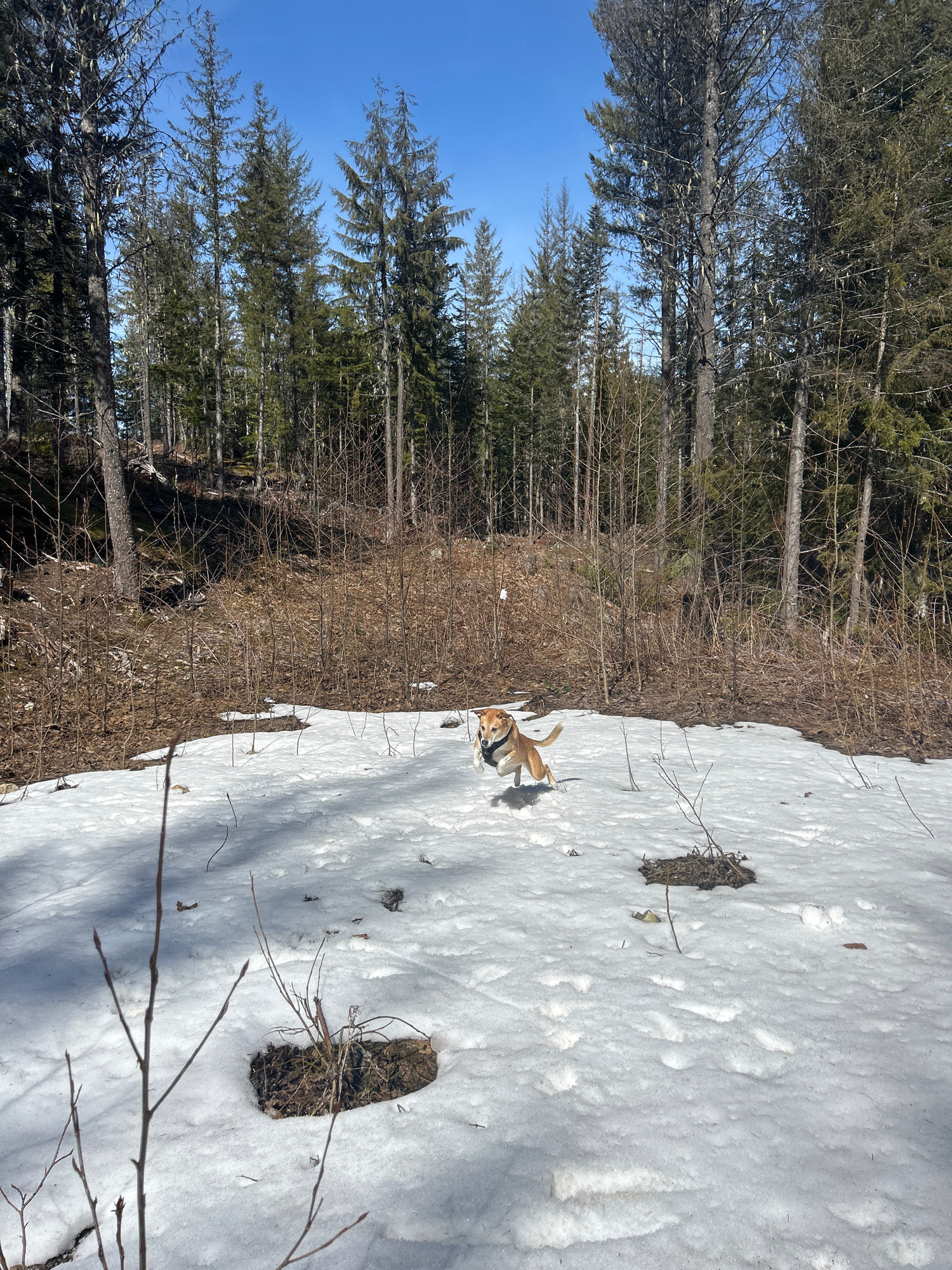 The image depicts a landscape scene in Whistler, Canada. The left side of the image features a dense forest of tall evergreen trees against a clear blue sky. The right side of the image shows a snow-c…read more